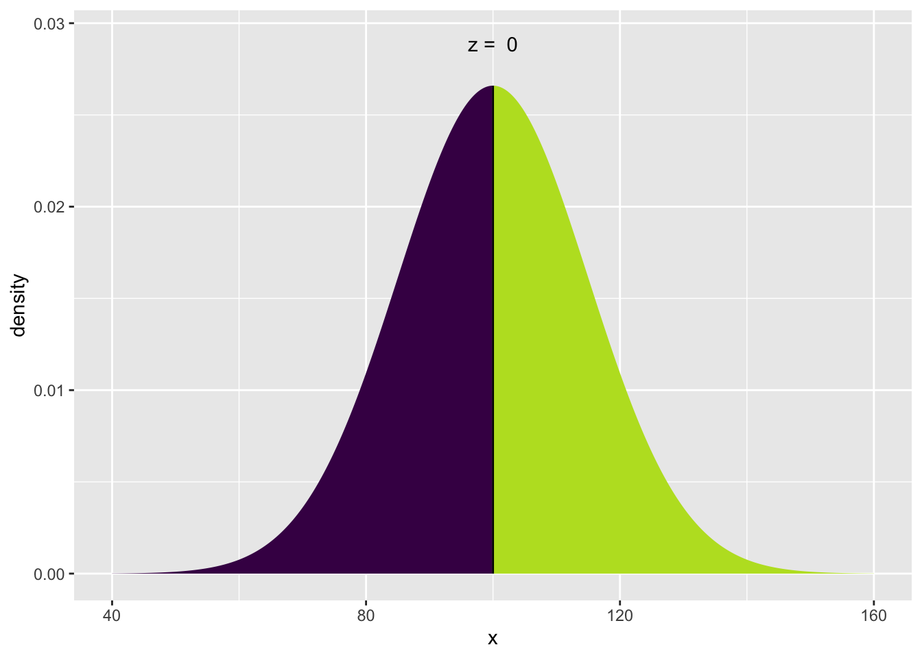 Sei \(X \sim N(100,15)\), dann ist \(Pr(X \le 100) \ne 1/2\).
