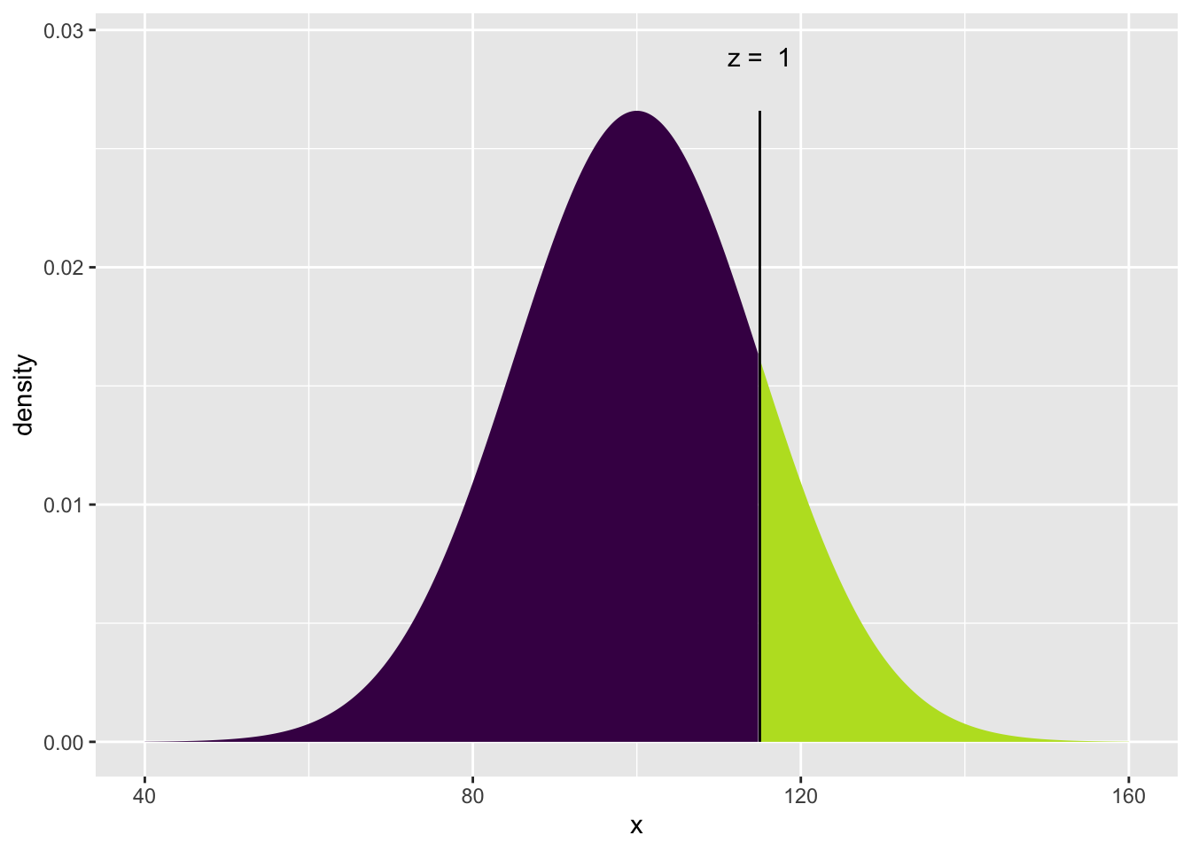 Sei \(X \sim N(100,15)\), dann ist \(Pr(X \ge 115) \approx 0.16\).