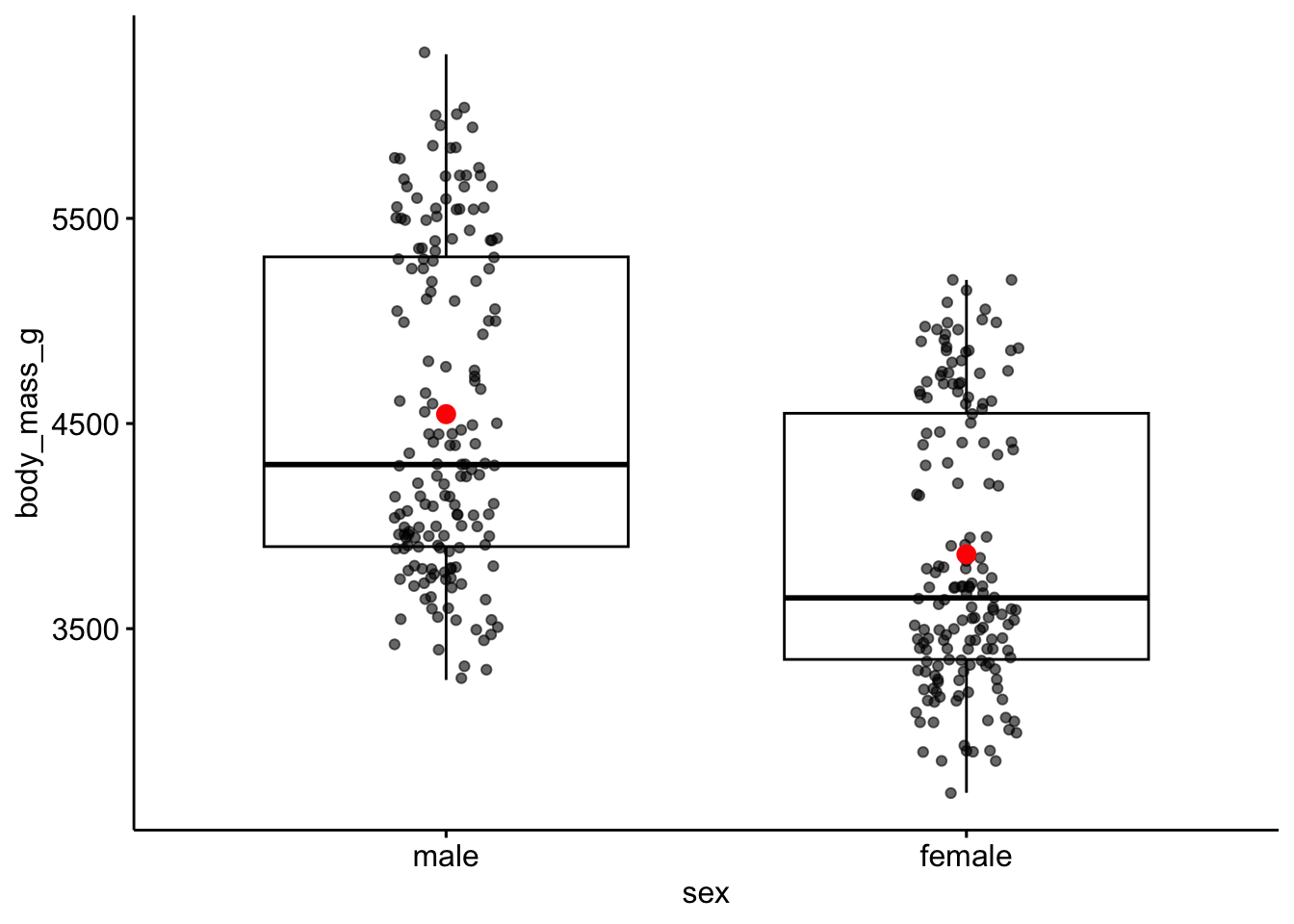 stat_summary(geom = "point", fun = mean, color = "red", size = 3)