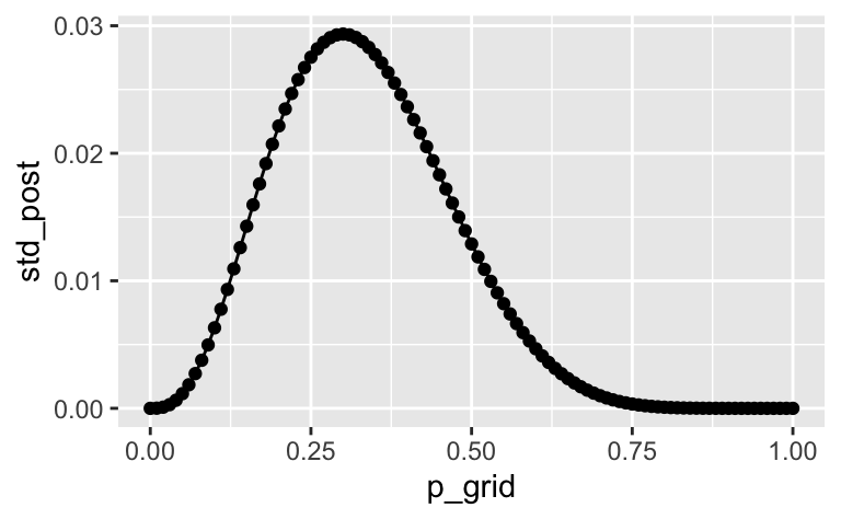 Likelihood = dbinom(x = 3, size = 10, prob = p_grid),
