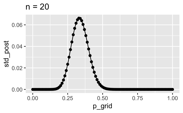 Likelihood = dbinom(x = 20, size = 60, prob = p_grid),