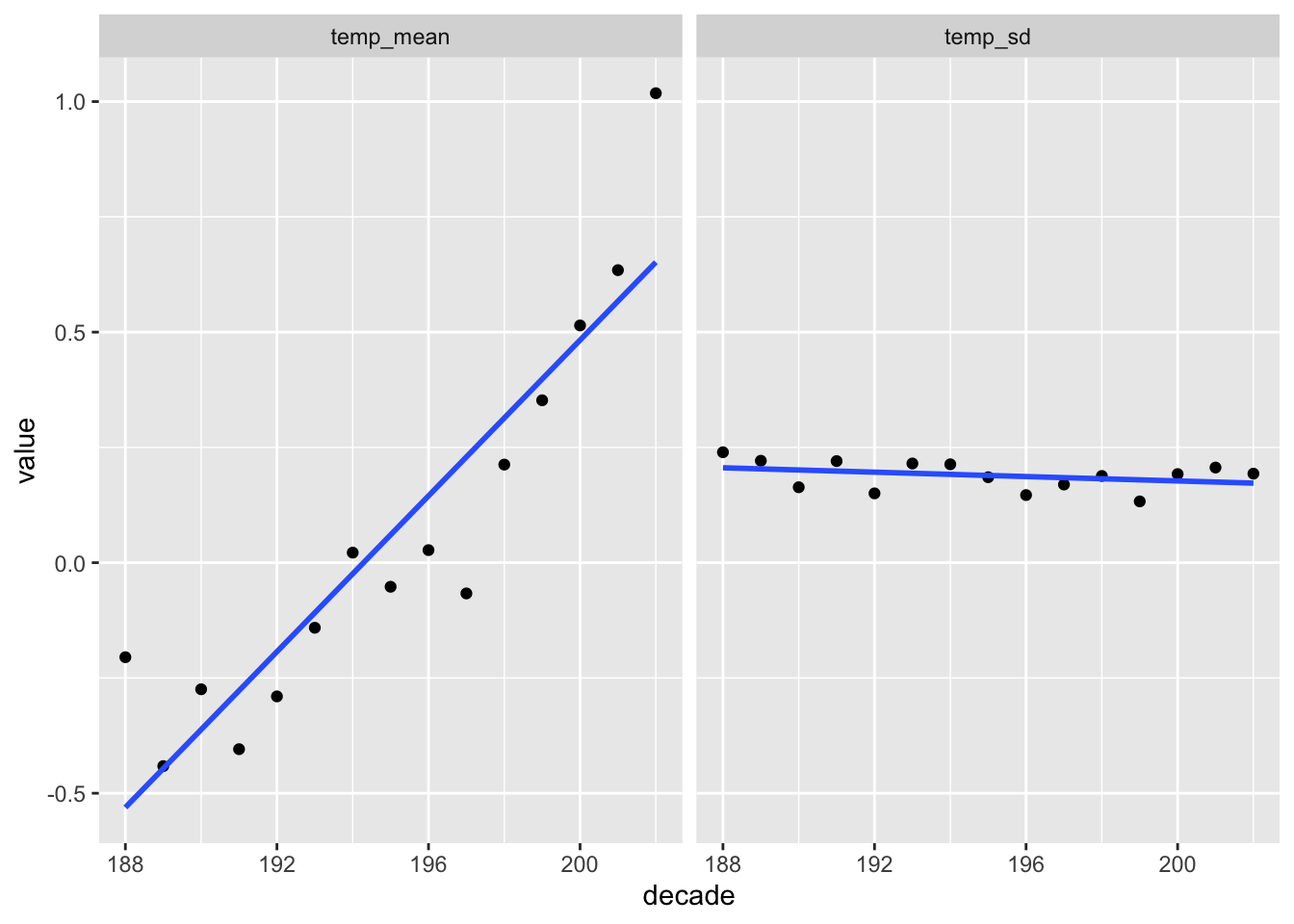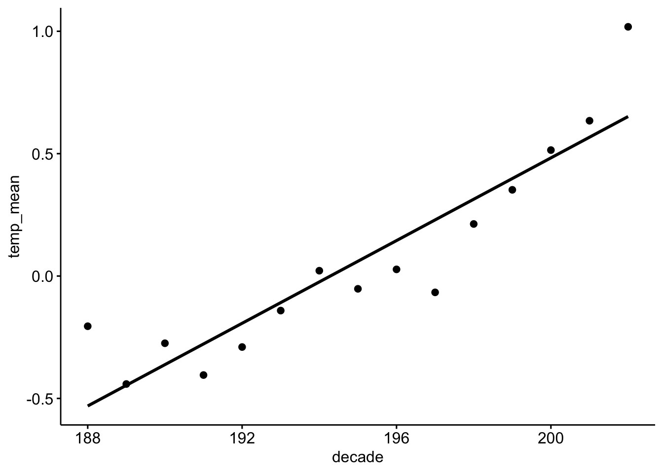 d_summarized ggplot(aes(x = decade, y = temp_mean)) +