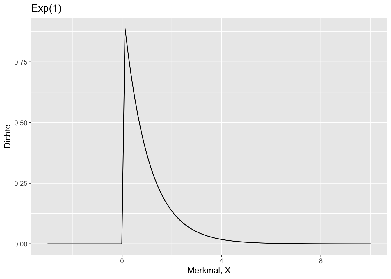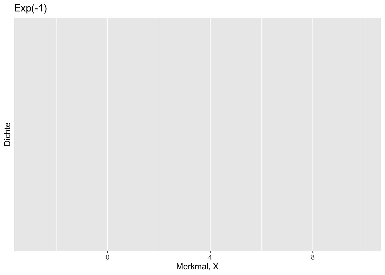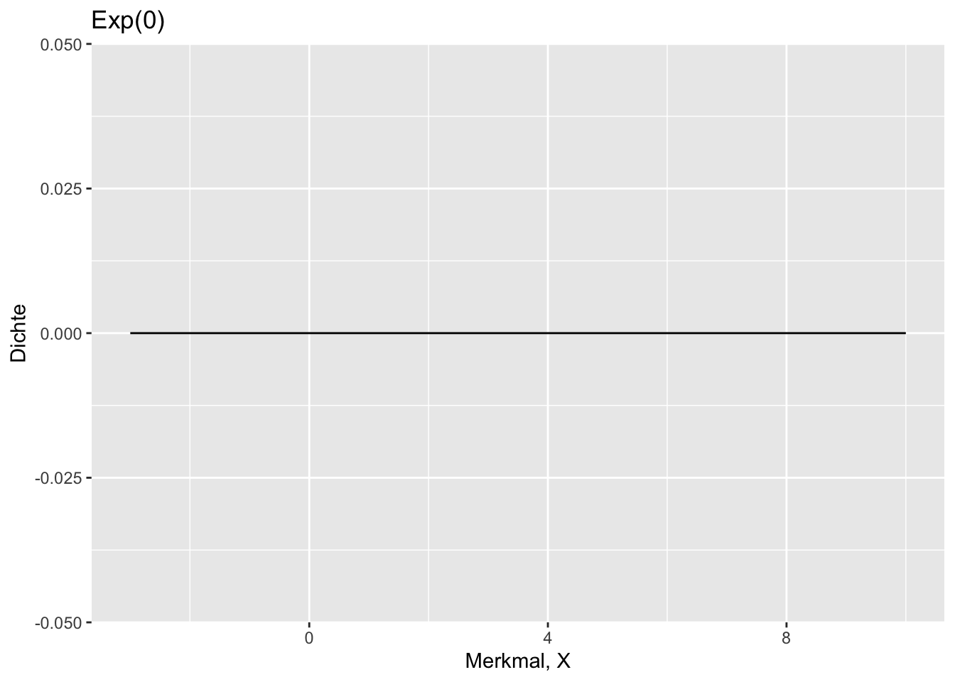 Die Rate der Exponentialverteilung regelt gleichzeitig Streuung und Mittelwert. Allerdings hat \(Exp(0)\) eine unendliche Streuung, was nicht wünschenswert ist. Eine negative Rate ist für die Exponentialverteilung nicht definiert.