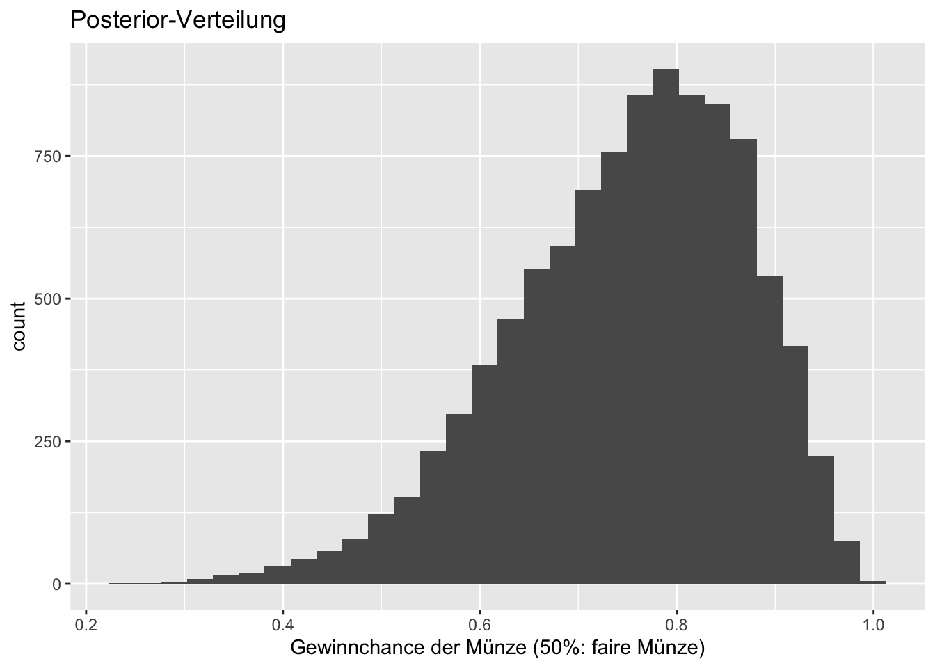 - Wie groß ist die Wahrscheinlichkeit, auf Basis der Post-Verteilung, dass die Münze zugunsten des Dozenten gezinkt ist?