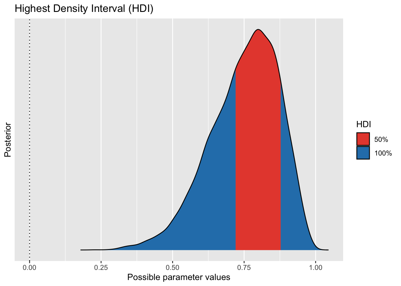 Interesant ist, dass das PI und das HDI zu unterschiedlichen Ergebnissen kommen. Das lässt auf eine schiefe Verteilung schließen. Außerdem eröffnet es den Raum zur Diskussion, welches Intervall man berichtet. Um diese Frage besser zu verstehen, können wir die Intervalle visualisieren.