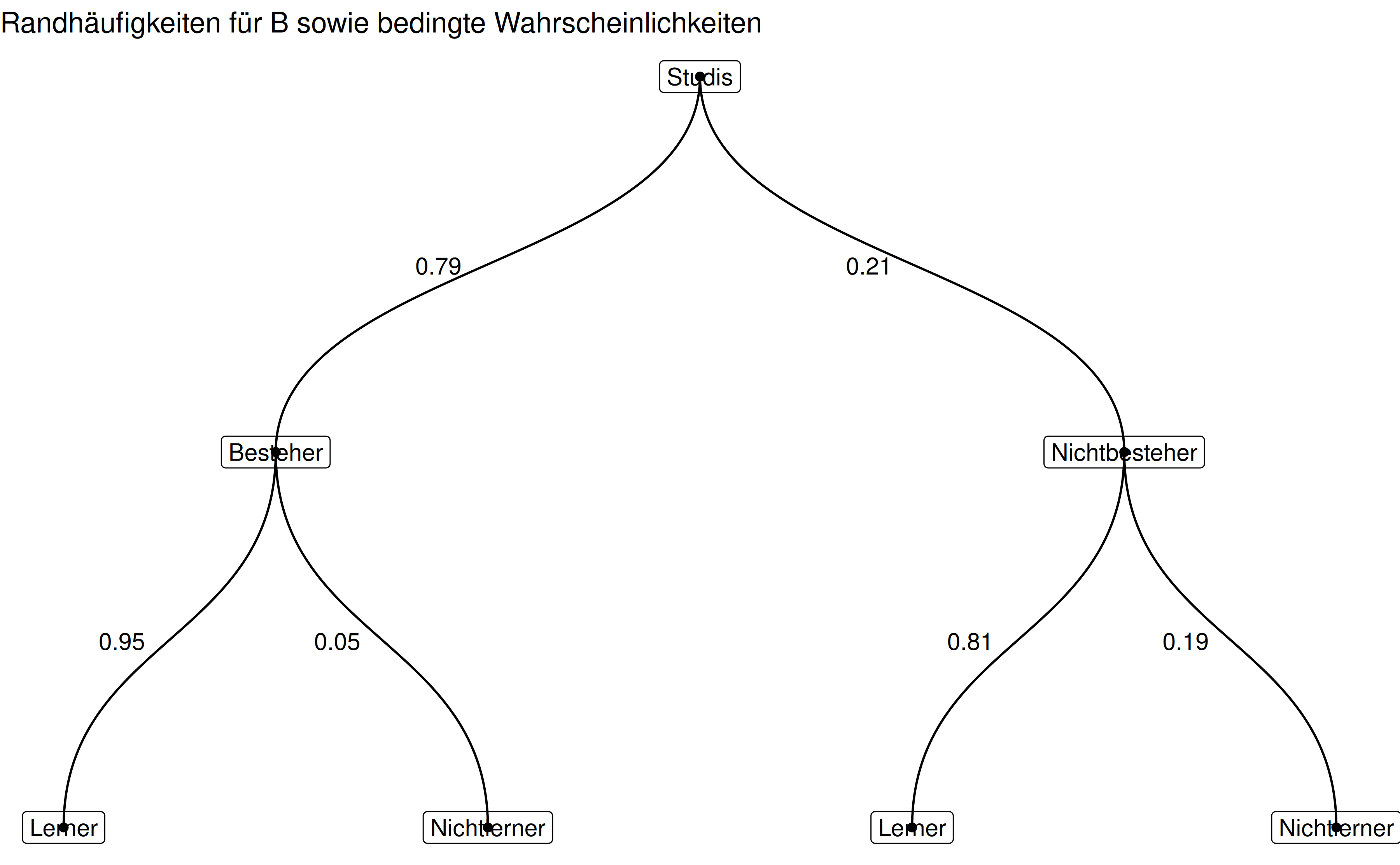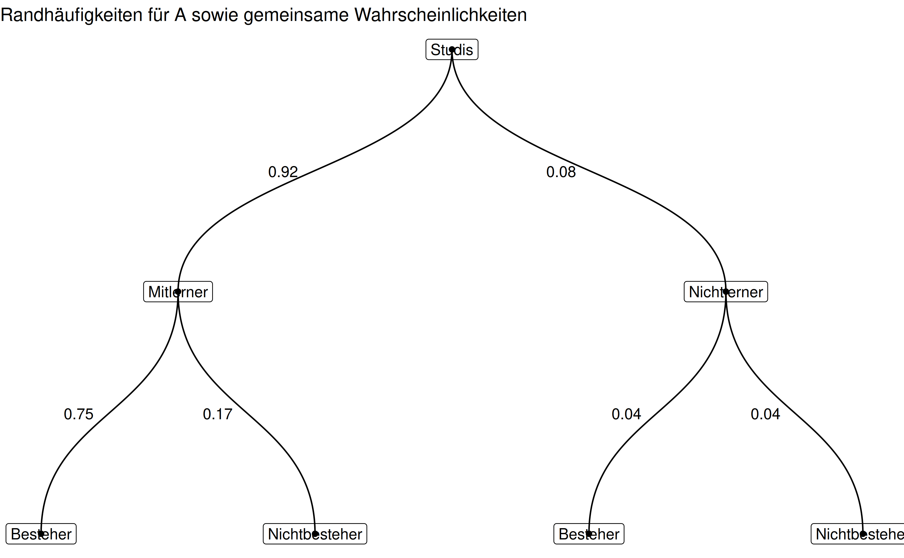 c("Zeichnen Sie (per Hand) ein Baumdiagramm, um die gemeinsamen Wahrscheinlichkeiten darzustellen. Weiterhin sollen die Randwahrscheinlichkeiten für $A$ dargestellt sein.",
