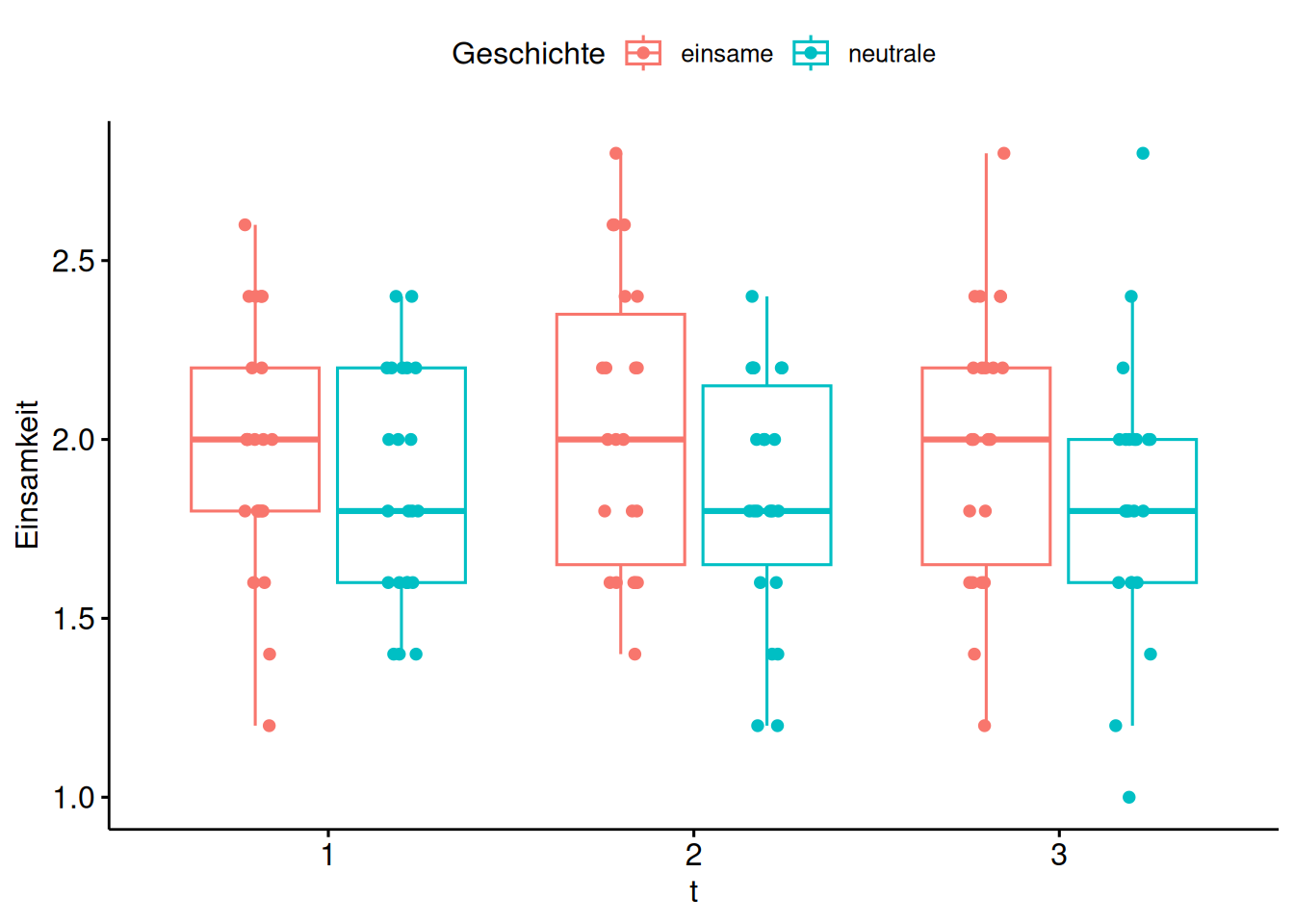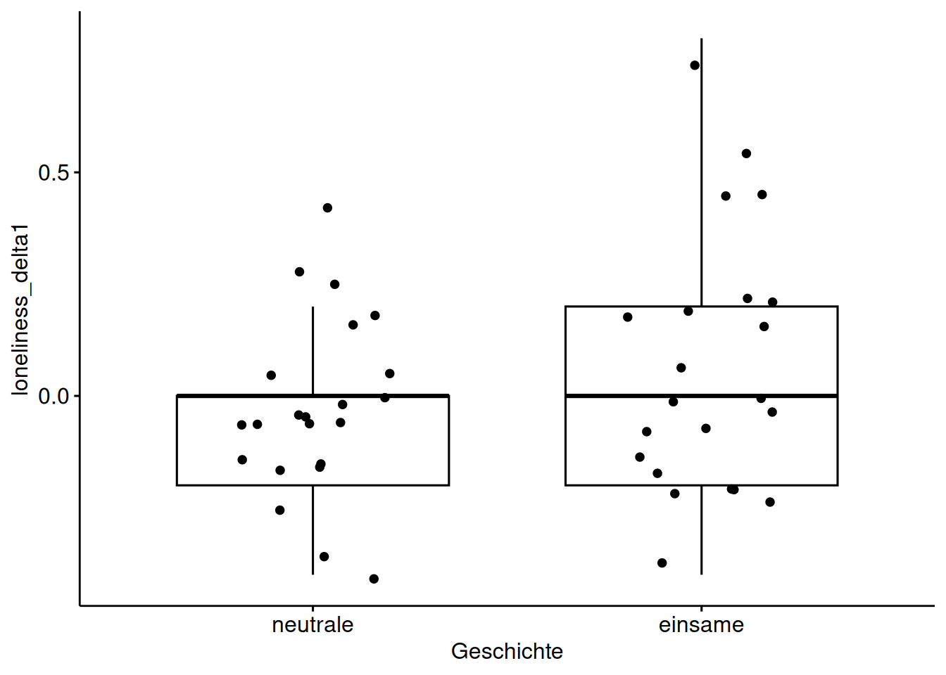 Es ist wenig Effekt zu erkennen. Interessanterweise hat die Gruppe der Einsamkeits-Intervention von vornherein einen höheren Wert in Einsamkeit. Das ist psychologisch interessant und sollte näher untersucht werden.