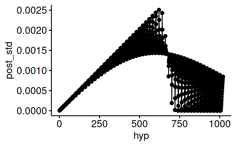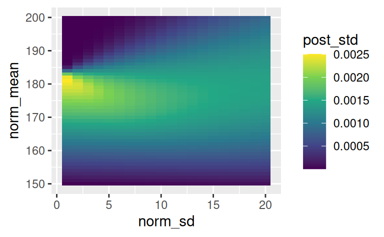 Die Antwort ist, dass für einen bestimmten Mittelwert jeweils 10 verschiedene SD-Werte zugeordnet sind. Und jeder SD-Wert (für einen MW-Wert) hat eine andere Post-Wahrscheinlichkeit!