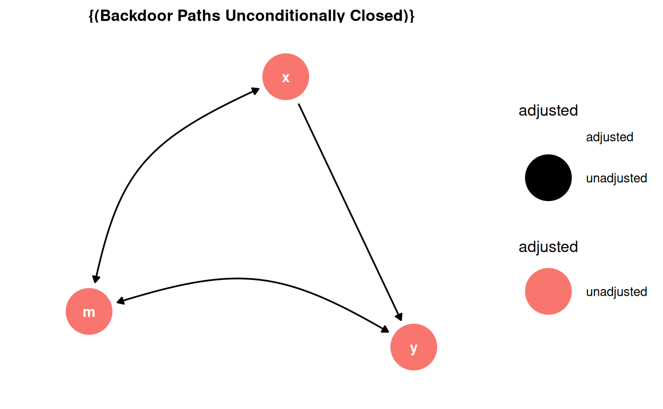 Keine. Der kausale Effekt von x auf y ist bereits identifiziert. “Identifiziert” bedeutet, dass die statistische Assoziation zwischen den beiden Variablen komplett kausal ist. Es gibt keine Hintertürpfade, keine Pfade also, die Scheinkorrelation erzeugen würden.