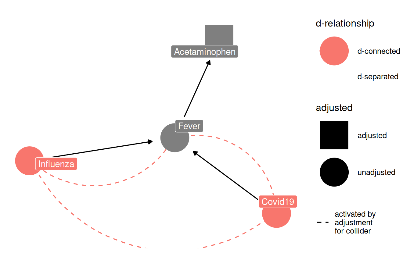 Acetaminophen ist ein Nachfahre von Fever, also wird die Kontrolle dieser Variable den grundsätzlich gleichen (nur etwas schwächeren) Effekt haben, wie das Kontrollieren der “kausalen Vorfahren”, hier Fever.