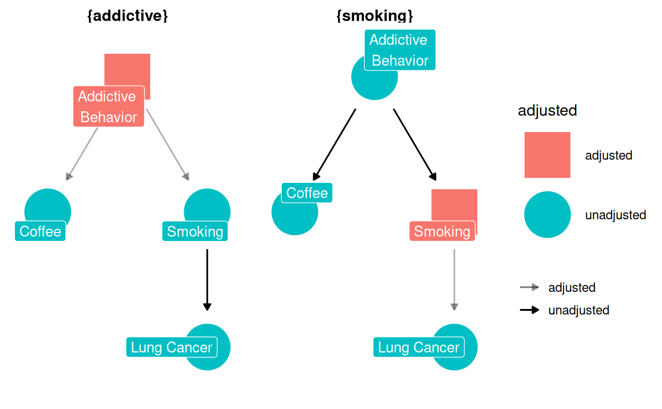 Durch Kontrolle von Addictive Behavior oder aber Rauchen wird der kausale Effekt von Coffee auf Lung Cancer identifiziert.