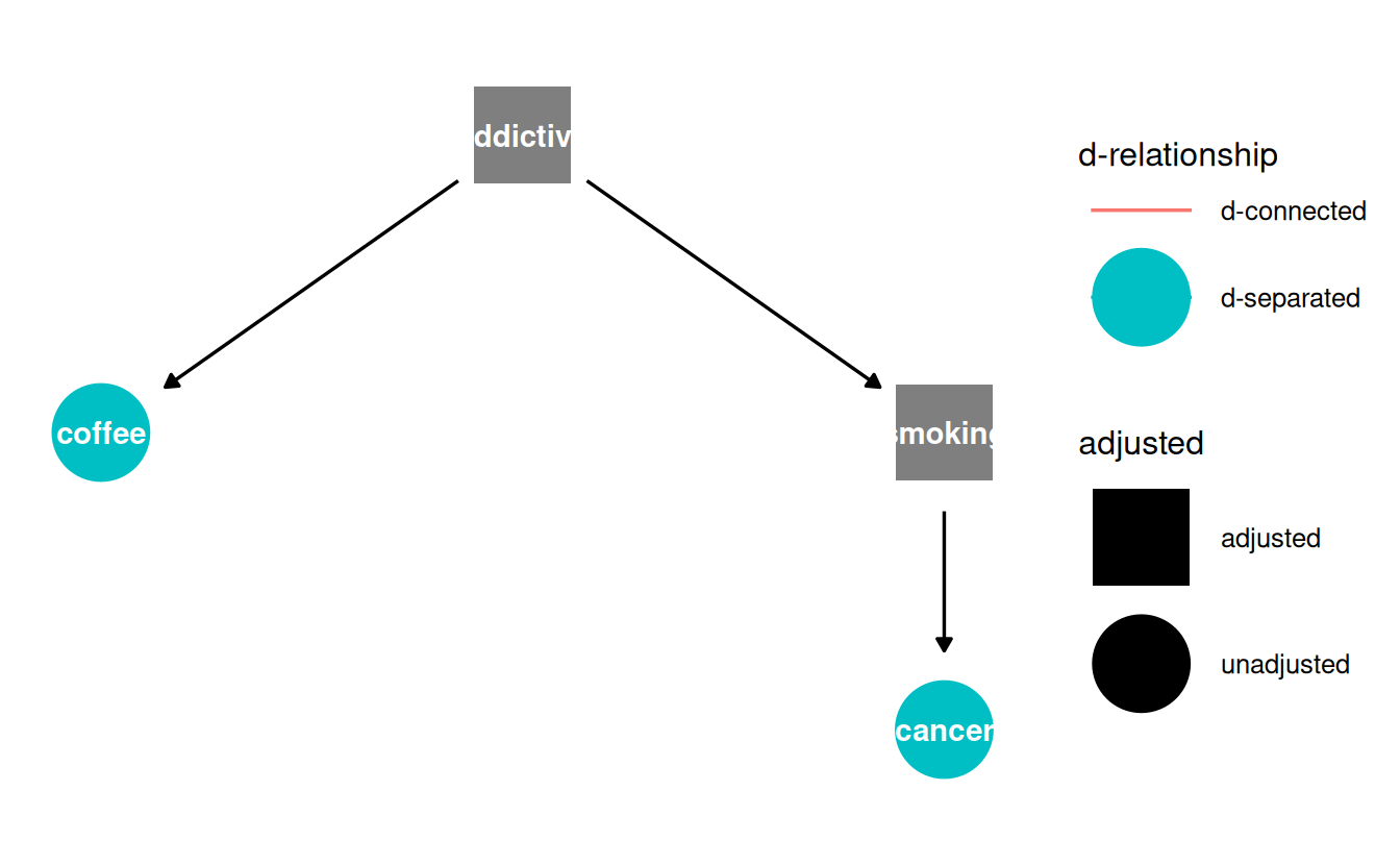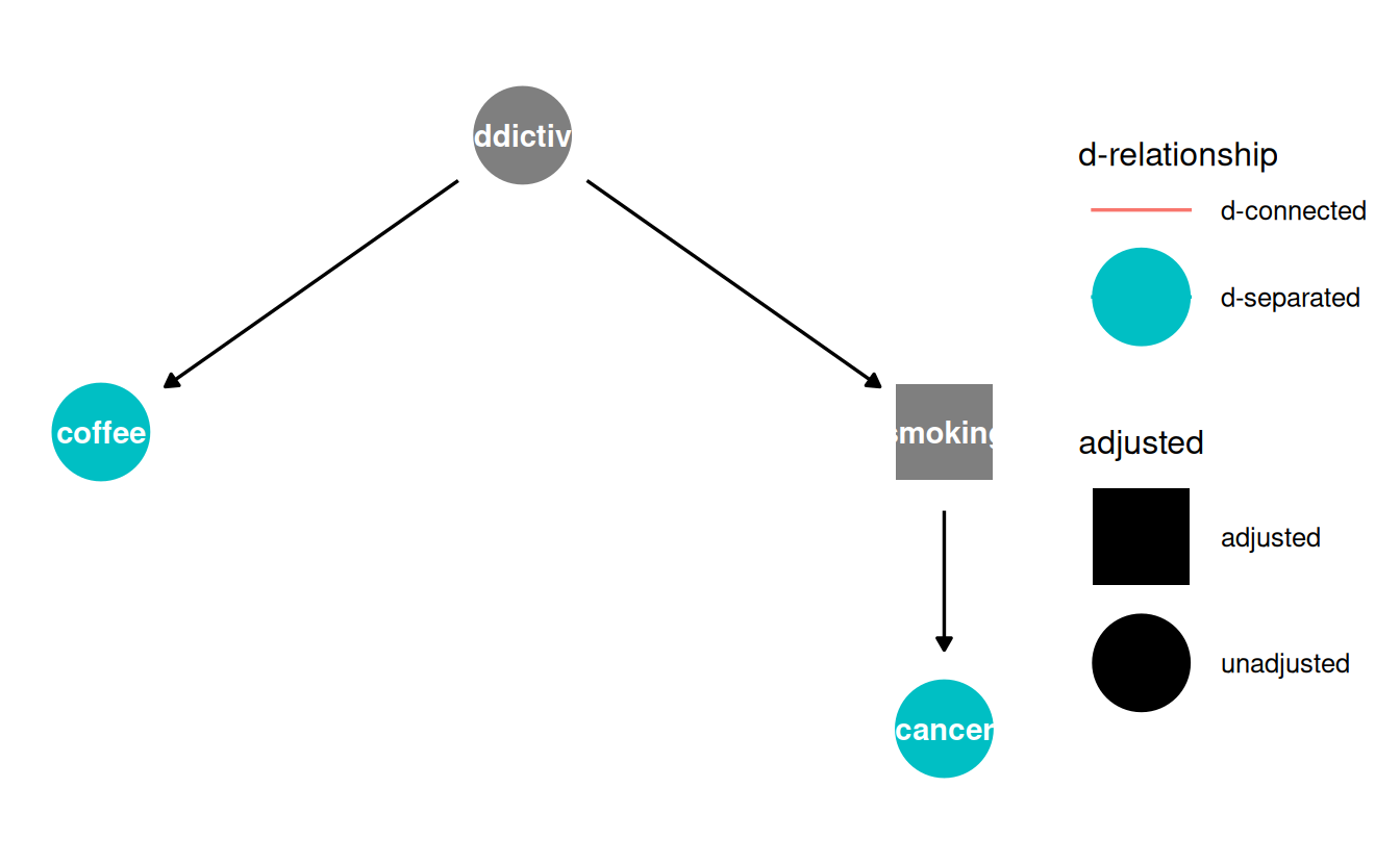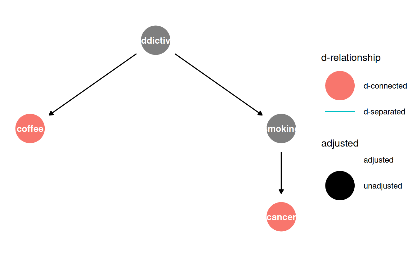 Gegeben sei die Theorie (oder schlichter: das Modell), demzufolge eine Anlage zu Suchtverhalten die Ursache von sowohl Rauchen als auch Kaffeegewohnheit darstellt. Lungenkrebs wiederum hat als (alleinige) Ursache Rauchen (laut diesem Modell).