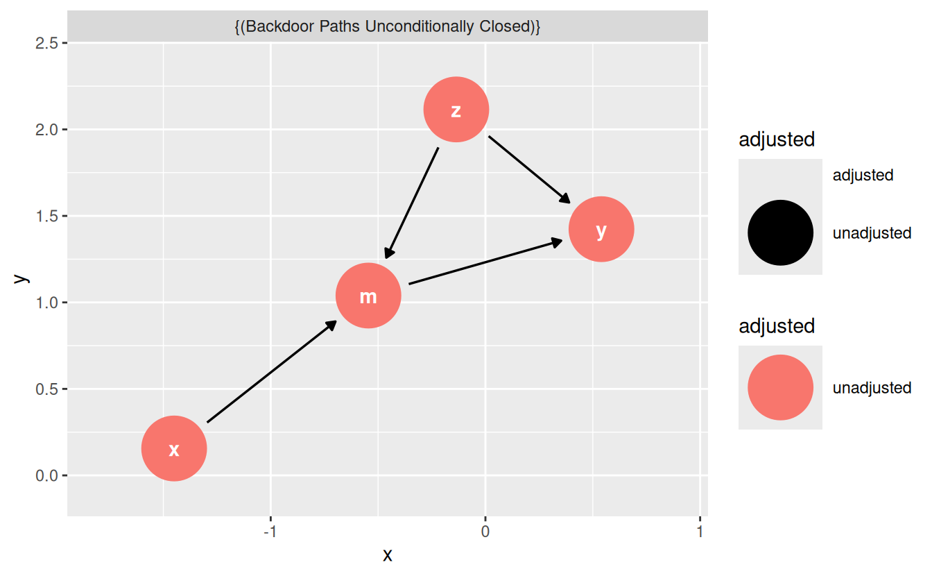 z muss nicht kontrolliert werden, da der Pfad x->my<-z->y wegen des Colliders bereits geschlossen ist. Es bleibt nur ein Pfad über und der ist kausal: x->m->y.