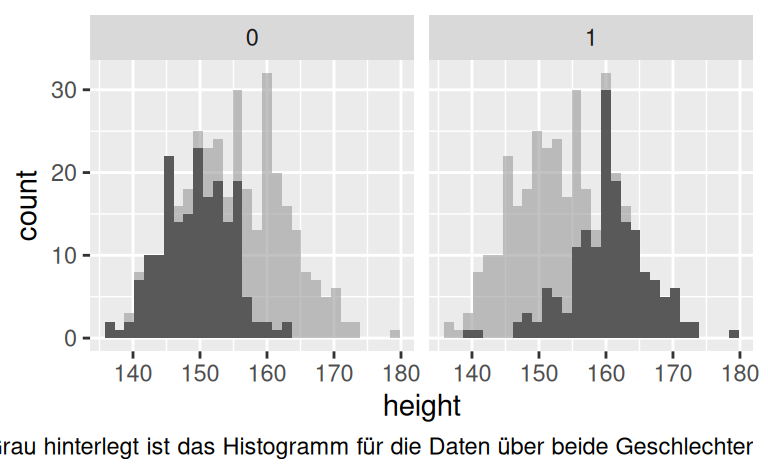 labs(caption = "Grau hinterlegt ist das Histogramm für die Daten über beide Geschlechter")