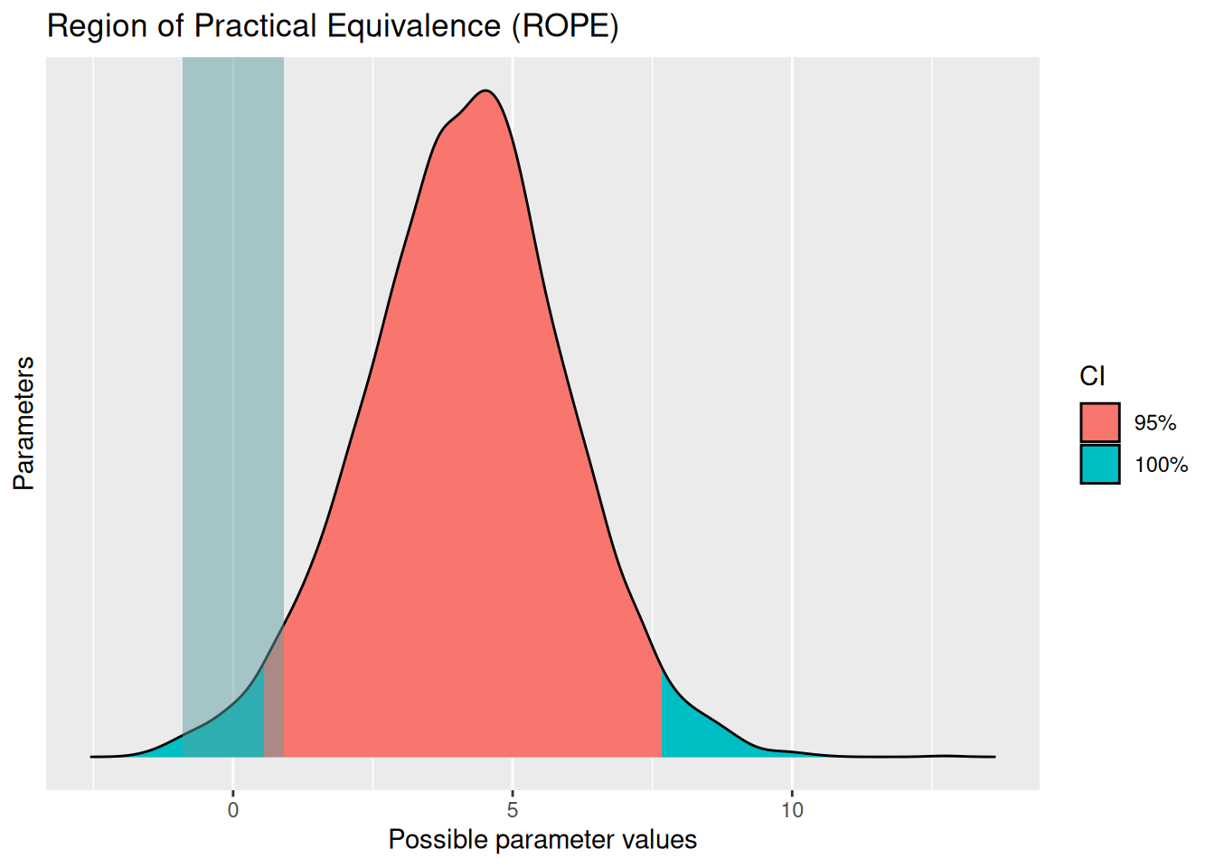 rope(lm1_bayes)| Parameter | CI | ROPE_low | ROPE_high | ROPE_Percentage | Effects | Component |