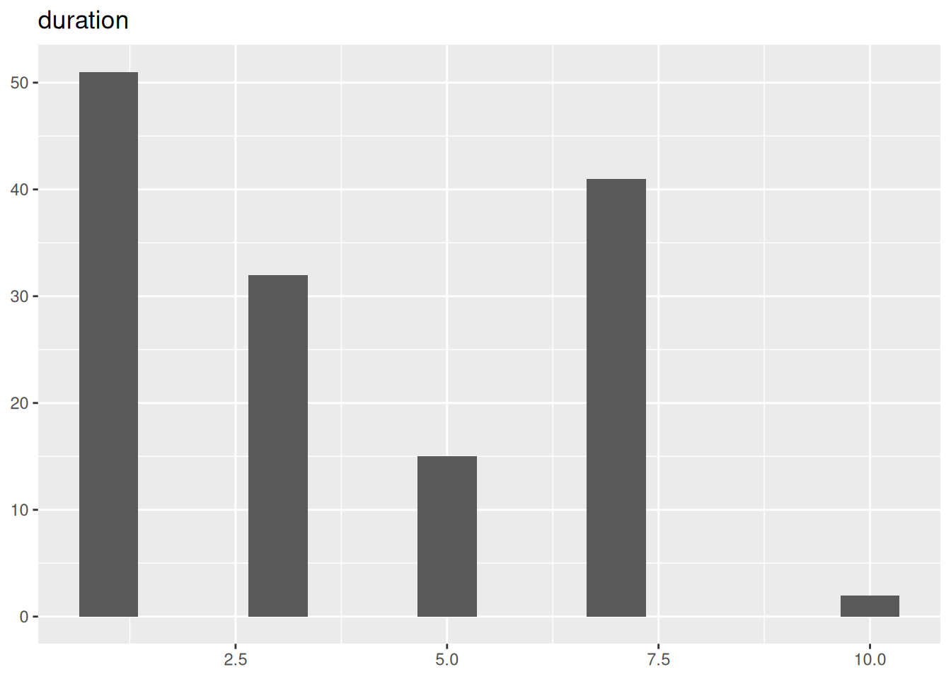 | duration | 0 | 1 | 3.750000e+00 | 2.590000e+00 | 1.000000e+00 | 1.000000e+00 | 3.000000e+00 | 7.000000e+00 | 1.000000e+01 | ▇▅▂▆▁ |