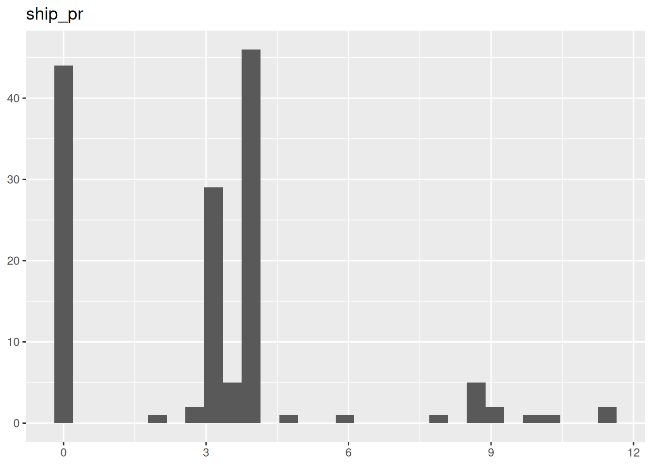 | ship_pr | 0 | 1 | 2.980000e+00 | 2.620000e+00 | 0.000000e+00 | 0.000000e+00 | 2.990000e+00 | 4.000000e+00 | 1.145000e+01 | ▅▇▁▁▁ |
