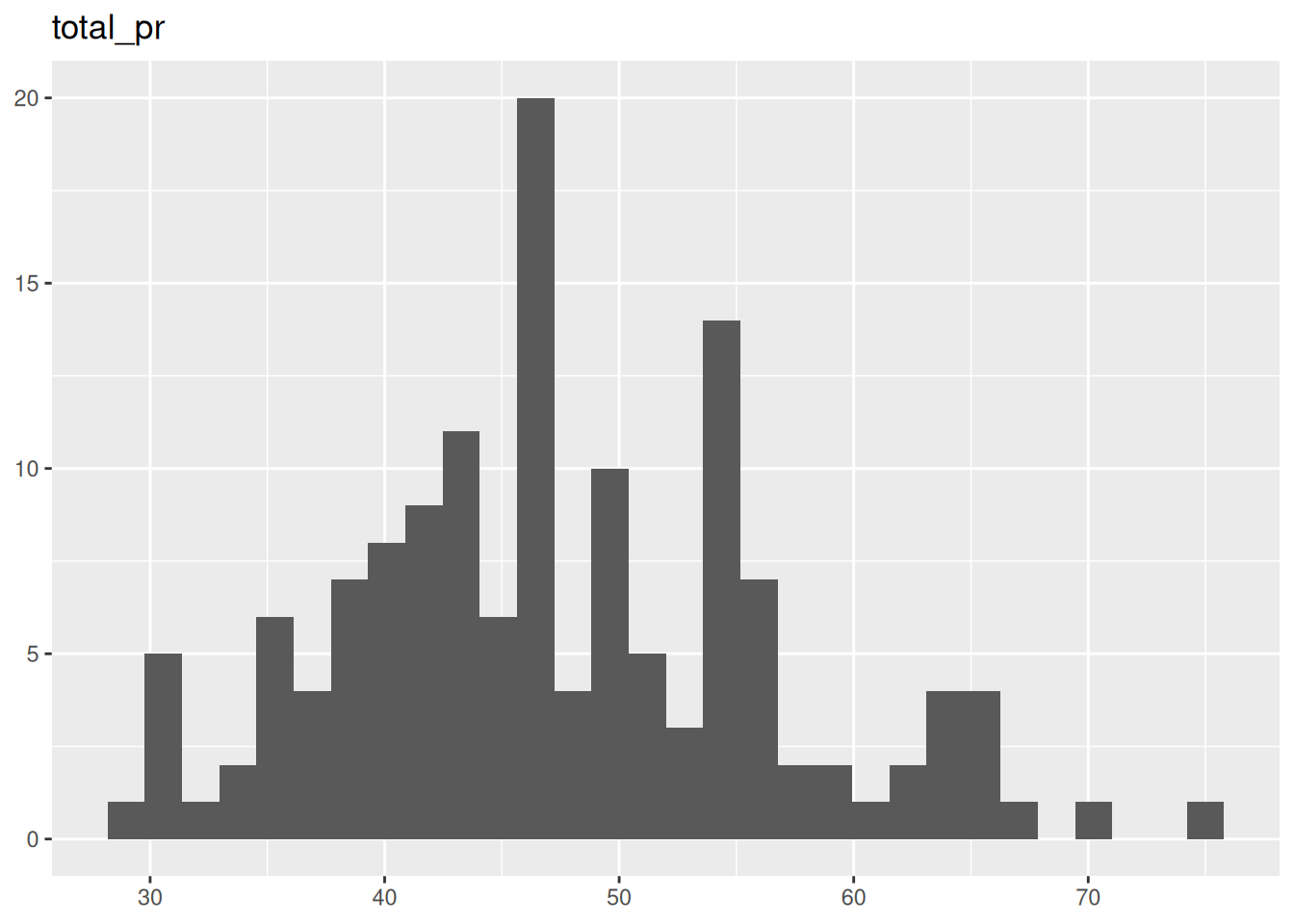 | total_pr | 0 | 1 | 4.743000e+01 | 9.110000e+00 | 2.898000e+01 | 4.100000e+01 | 4.603000e+01 | 5.399000e+01 | 7.500000e+01 | ▃▇▆▂▁ |