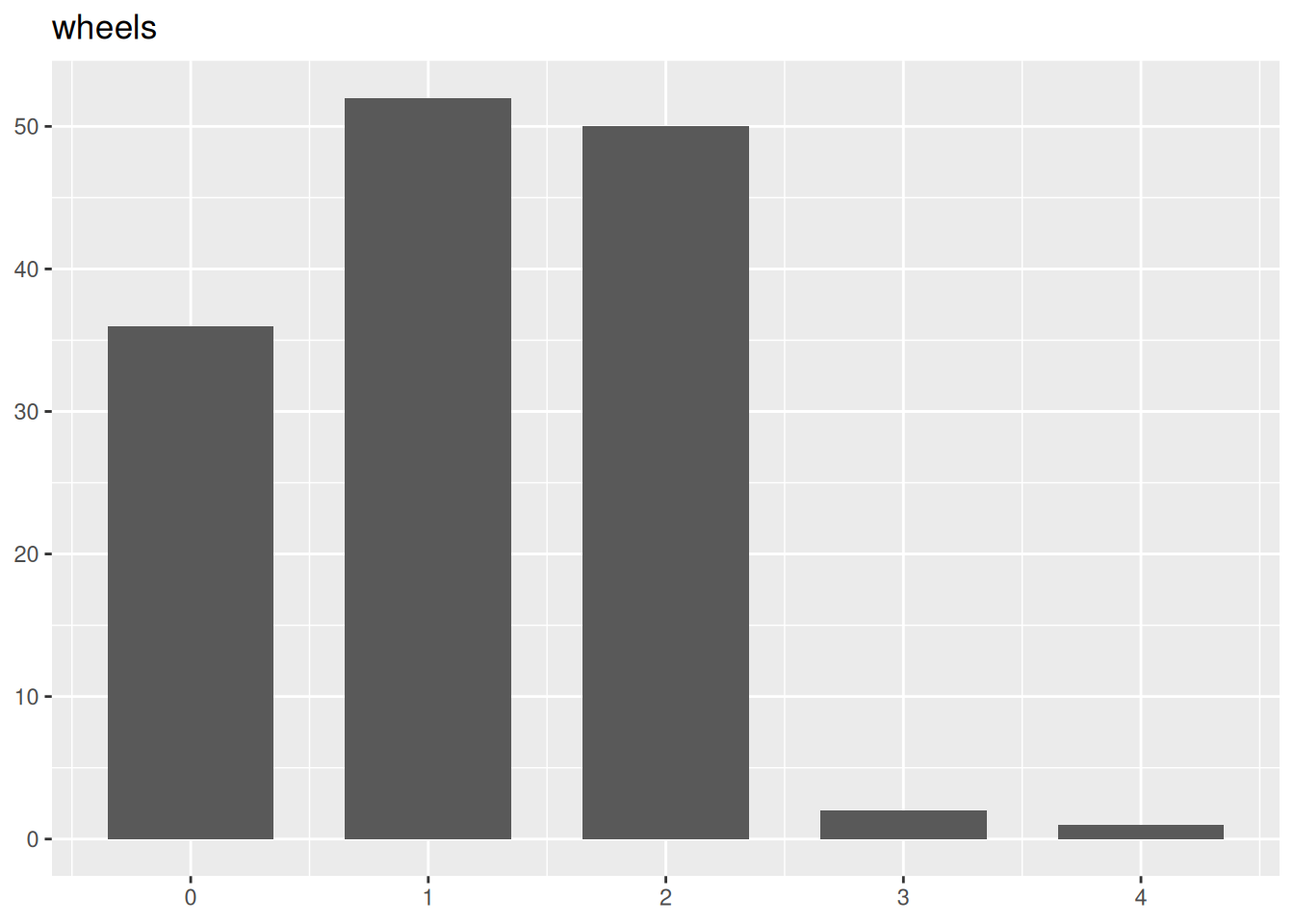 | wheels | 0 | 1 | 1.150000e+00 | 8.400000e-01 | 0.000000e+00 | 0.000000e+00 | 1.000000e+00 | 2.000000e+00 | 4.000000e+00 | ▆▇▇▁▁ |