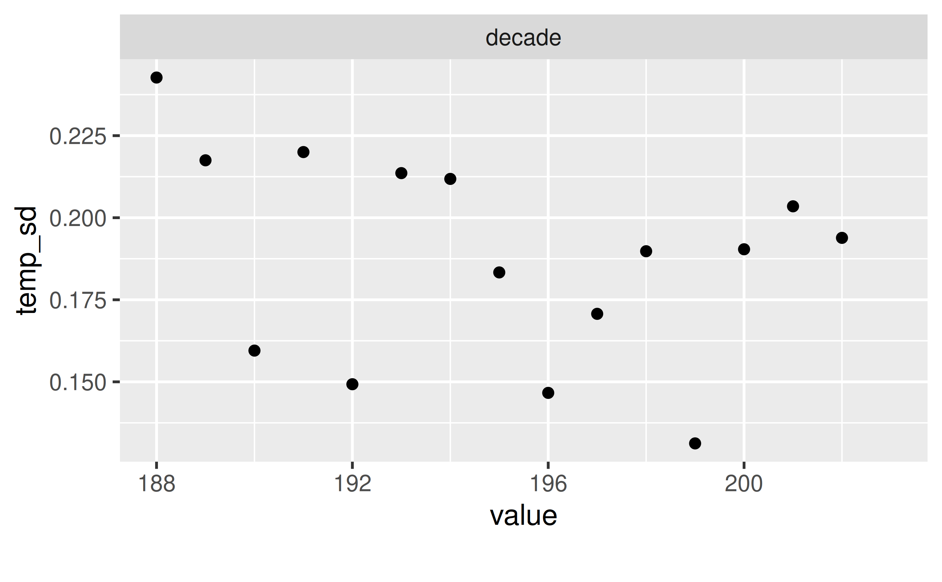 d_summarized| decade | temp_mean | temp_sd |