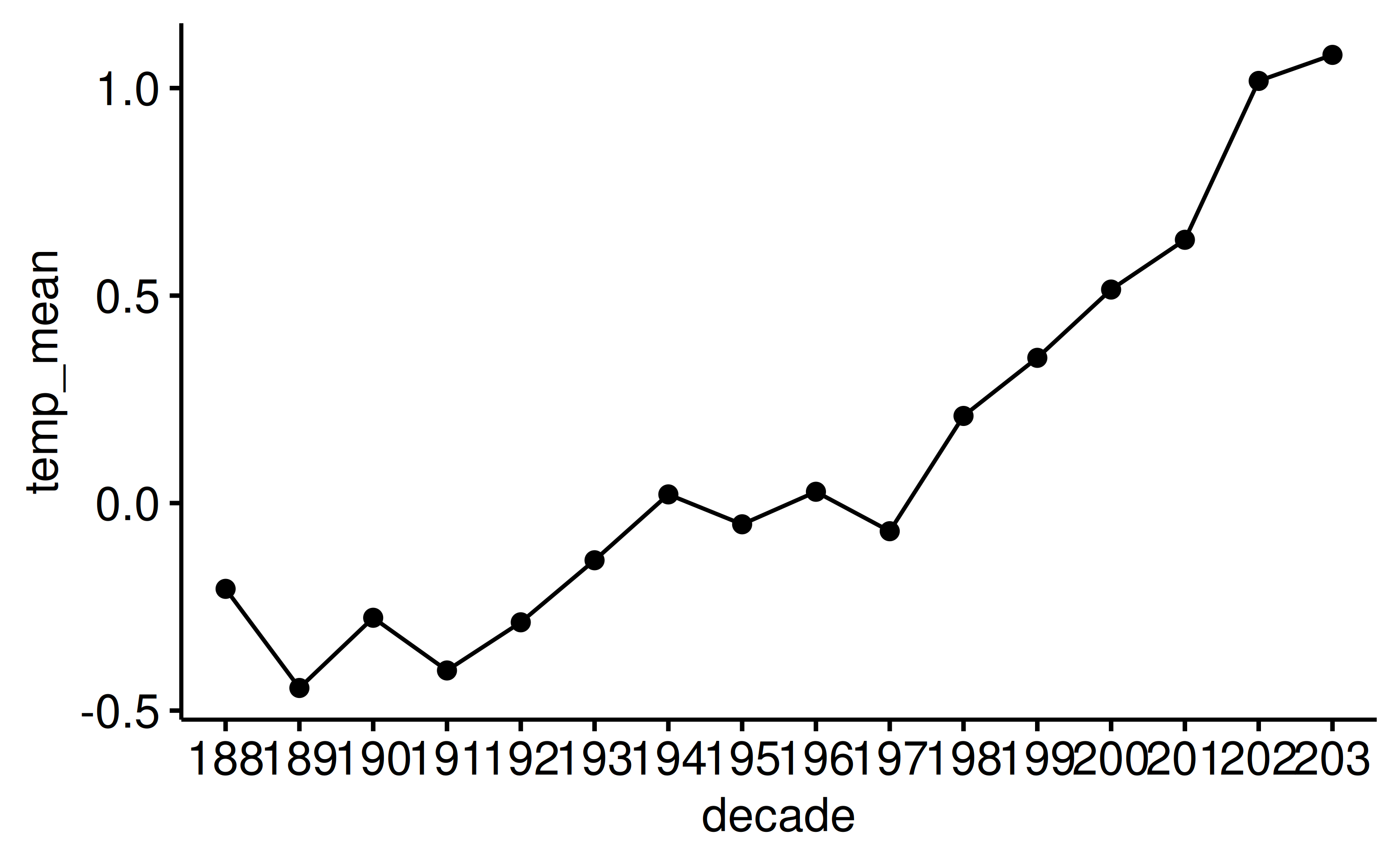 select(decade, temp_mean) |>