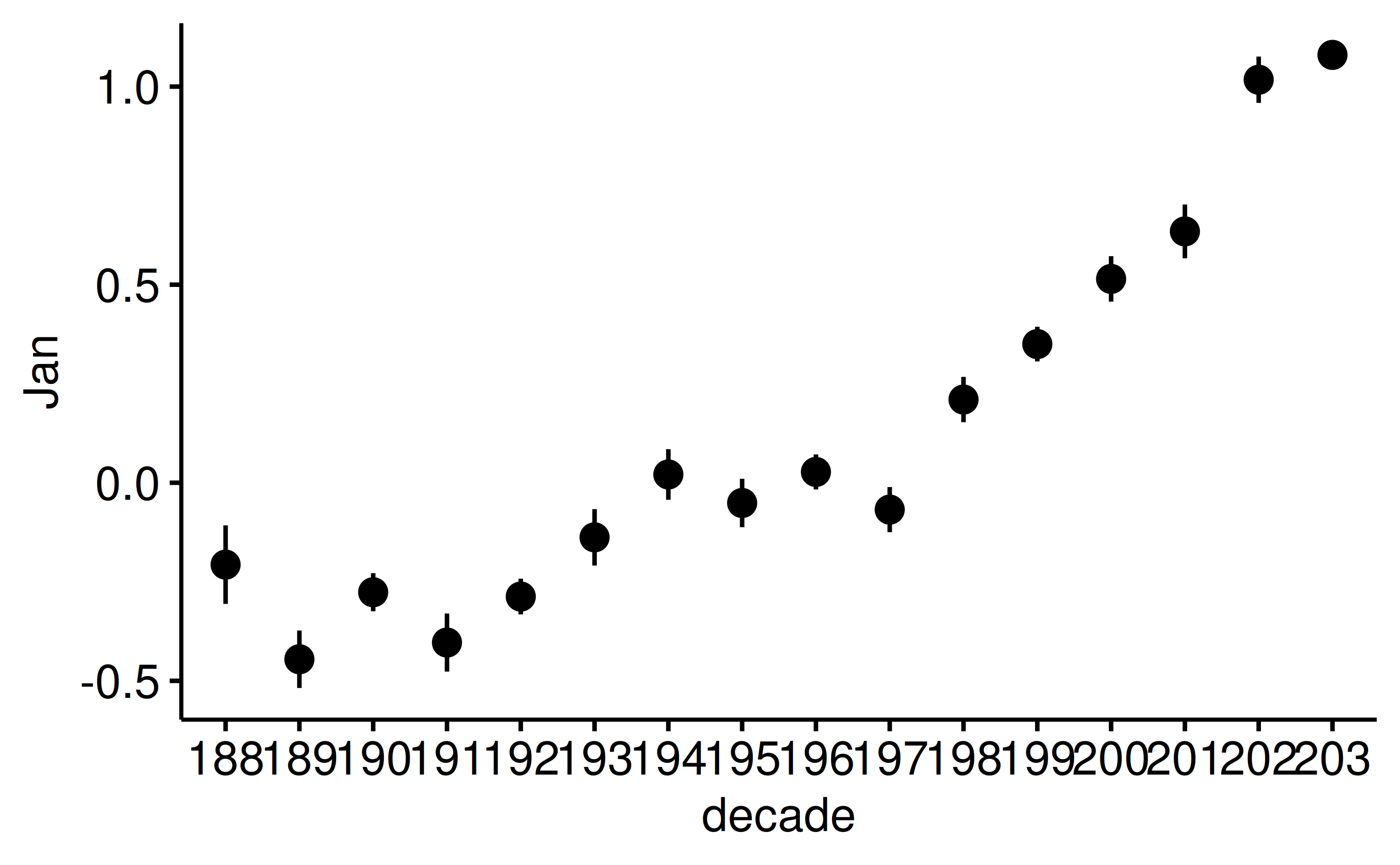 ggerrorplot(x = "decade", y = "Jan")