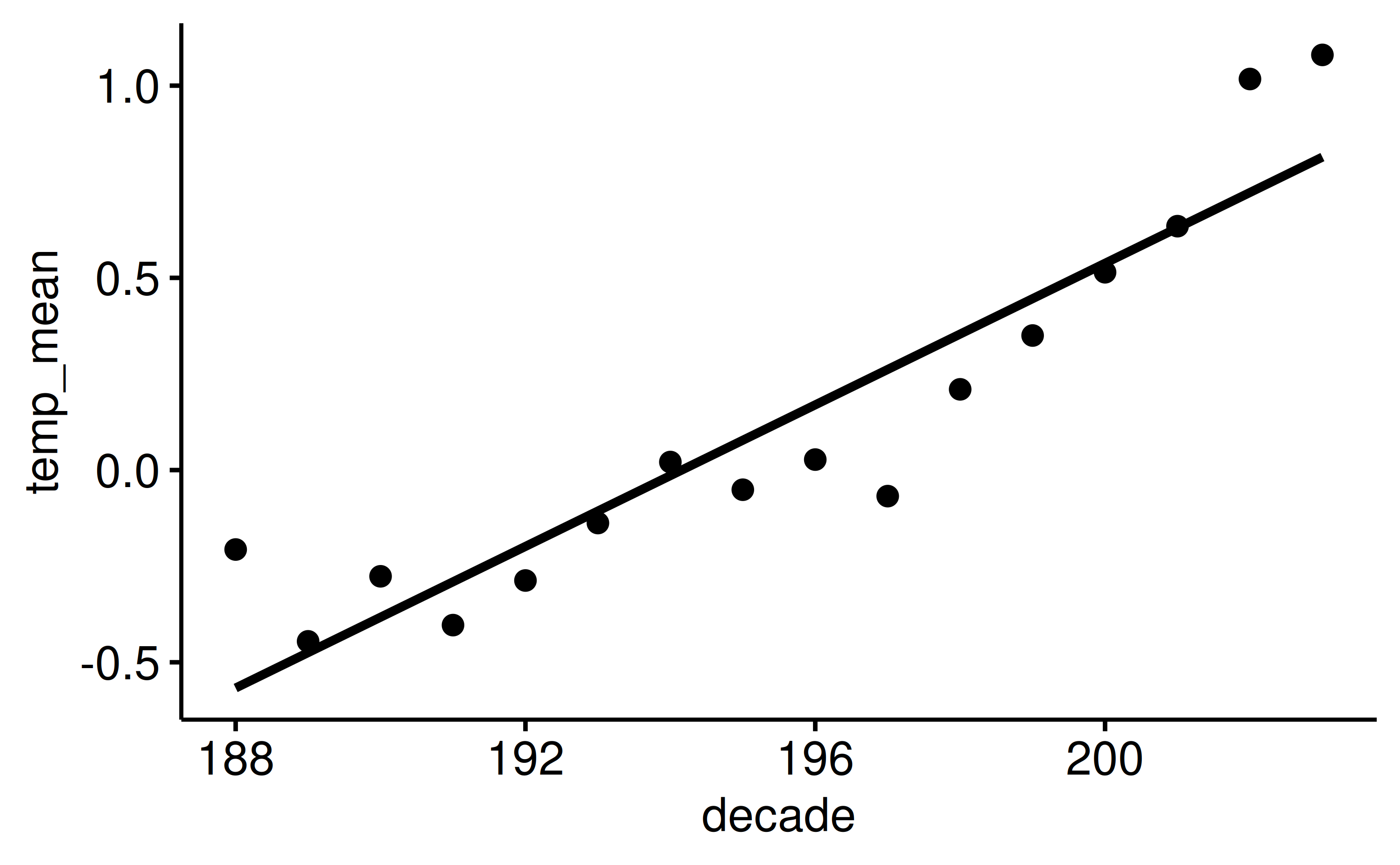ggscatter(d_summarized, x = "decade", y = "temp_mean", add = "reg.line")