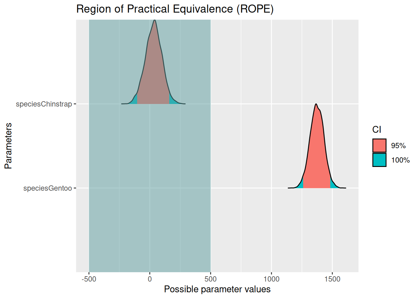 m |> rope(range = c(-500, 500))| Parameter | CI | ROPE_low | ROPE_high | ROPE_Percentage | Effects | Component |