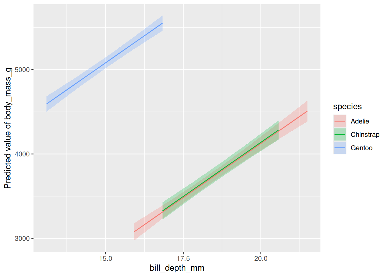 Das bedeutet: Wenn wir die Spezies berücksichtigen, dann ist der Zusammenhang zwischen Schnabeltiefe und Gewicht positiv.