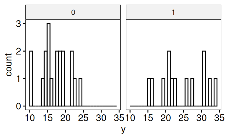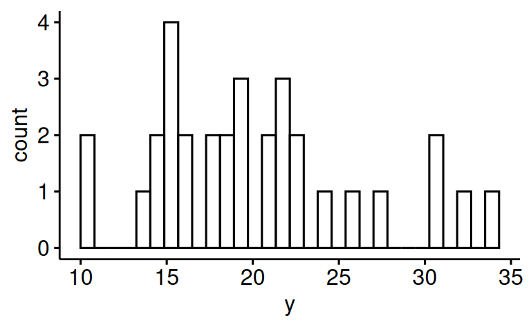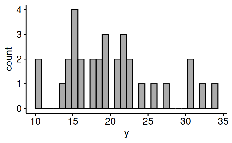 rename(y = mpg, x1 = am, x2 = hp)Visualisieren Sie die Verteilung von y auf zwei verschiedene Arten.