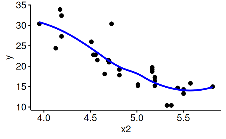 ggscatter(d_logged, x = "x2", y = "y", add = "loess",