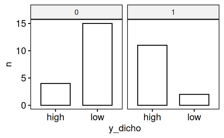 - Dichotomisieren Sie y und zählen Sie die Häufigkeiten. Achtung: Dichotomisieren wird von einigen Statistikern mit Exkommunikation bestraft. Proceed at your own risk.