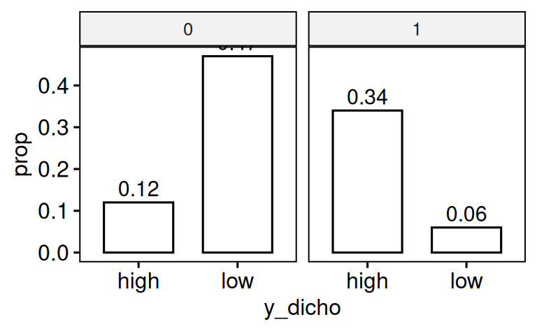 ggbarplot(d_count, x = "y_dicho", y = "prop", facet.by = "x1", label = TRUE)