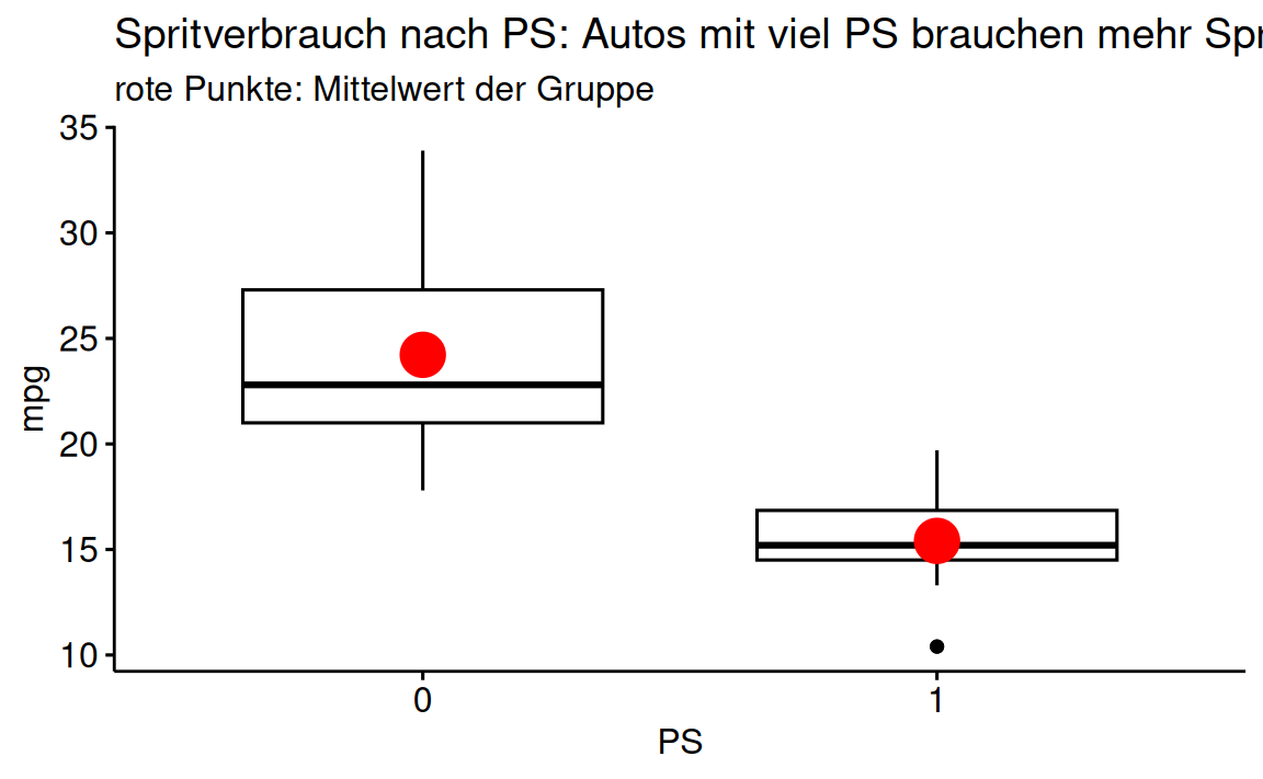 Der Effekt von PS ist negativ, was bedeutet, dass Autos der Gruppe PS=1 einen um ca. 9 Meilen geringeren MPG-Wert haben als Autos der Gruppe PS=0. Das bedeutet, dass Autos mit viel PS einen höheren Spritverbrauch haben als Autos mit wenig PS.