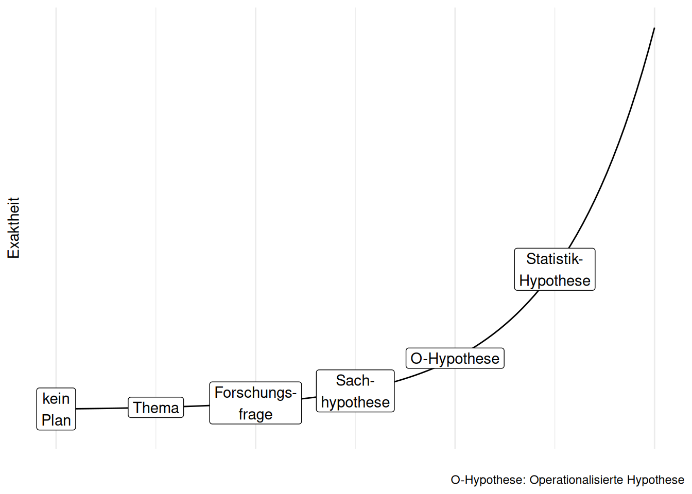 Ist eine Hypothese nicht in Aussagenform, so ist es gar keine Hypothese. E ine Aussage ist ein Satz, der wahr oder falsch sein kann7. Beispiele für eine Aussage sind “Paris ist die Hauptstadt von Spanien” oder “(Alle) Einhörner mögen rosa Pullis”8 Keine Aussage wäre “Entweder ist x=1 oder nicht”9 oder “Hilft Lernen beim Studienerfolg?”. Aussagen sind somit (prinzipiell) falsifizierbar.10
