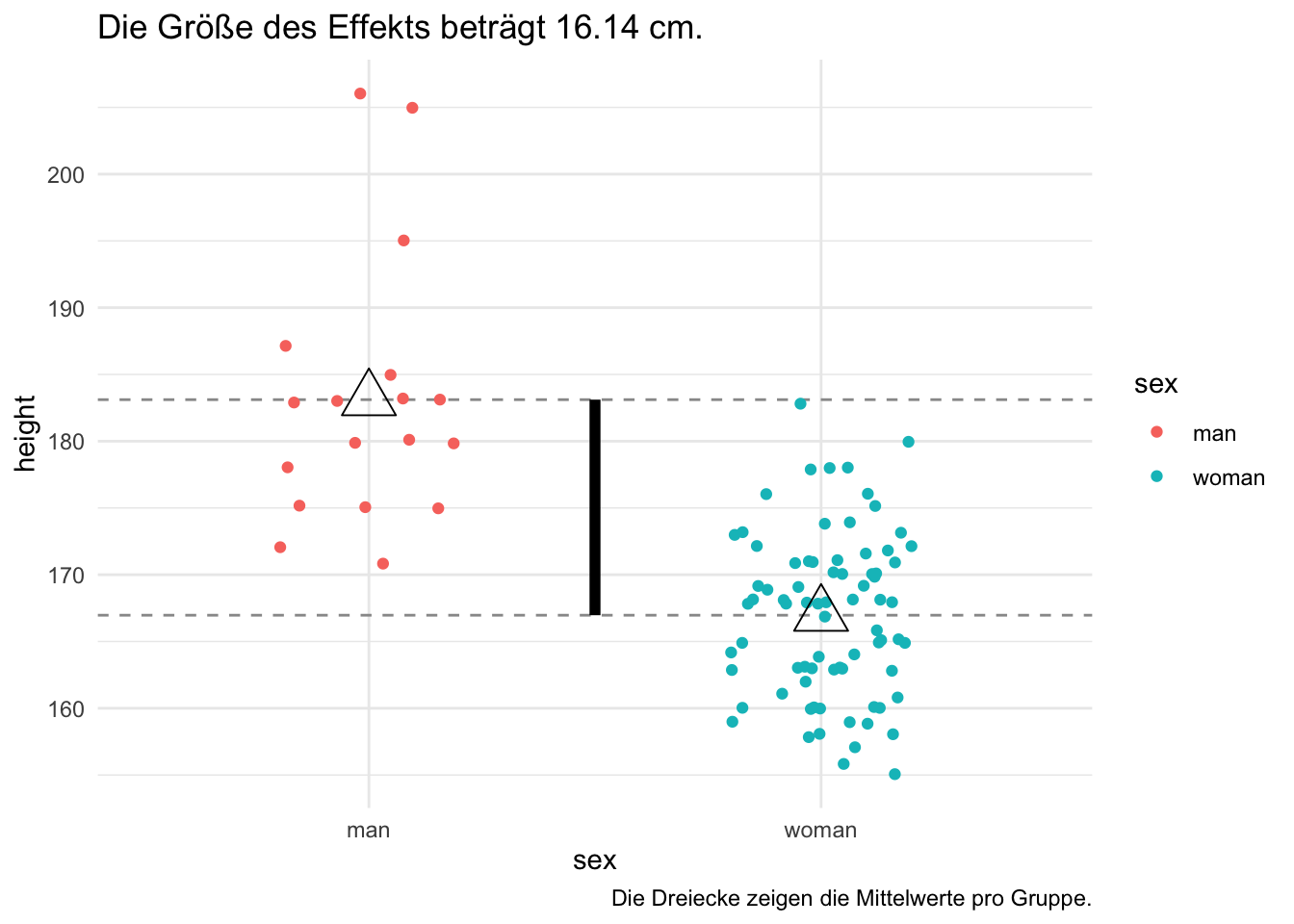 Beispiel 6.4 Abbildung 6.2 zeigt die Körpergrößen einiger Studentinnen (female) und Studenten (male) eines Studiengangs der Wirtschaftspsychologie. Hintergrund ist eine (fiktive) Studie, die nach dem Unterschied der mittleren Körpergrößen, \(d\) von Studentis fragt. In dem Beispiel ist \(d\) der Effekt, auch Signal genannt. Die einzelnen Datenpunkten, also die Körpergrößen der einzelnen Personen (als Punkte dargestellt) sind Rauschen. Genauer gesagt: Die Streuung innerhalb der Gruppen “übertönt” den Effekt \(d\), diese Streuung nennt man Rauschen oder Fehlerstreuung.\(\square\)
