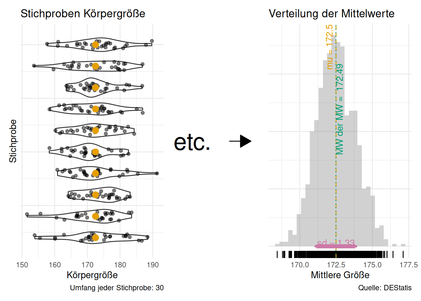 Abbildung 10.6 veranschaulicht die Daaseinsberechtigung der Inferenzstatistik: Eine einzelne Stichprobe schätzt den Mittelwert der Population (\(\mu\)) ungenau (je kleiner die Stichprobe, desto ungenauer, ceteris paribus). Daher brauchen wir eine Angabe, wie (un)genau unser Mittelwert wohl den “wahren” Mittelwert der Population (\(\mu\)) schätzt. Genau das macht die Inferenzstatistik!
