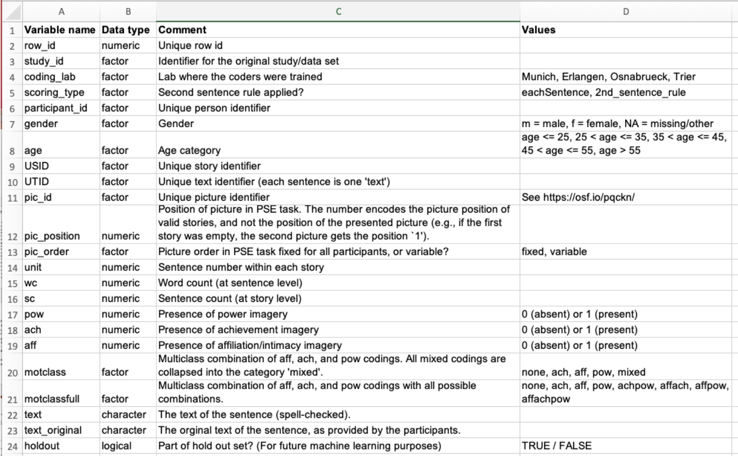 Ein Teil der Dokumentation ist ein Codebook (auch Data-Dictionary genannt). Ein Codebook erläutert die Namen der Variablen in Ihrer (Roh-)Datentabelle, s. Abbildung 10.2.