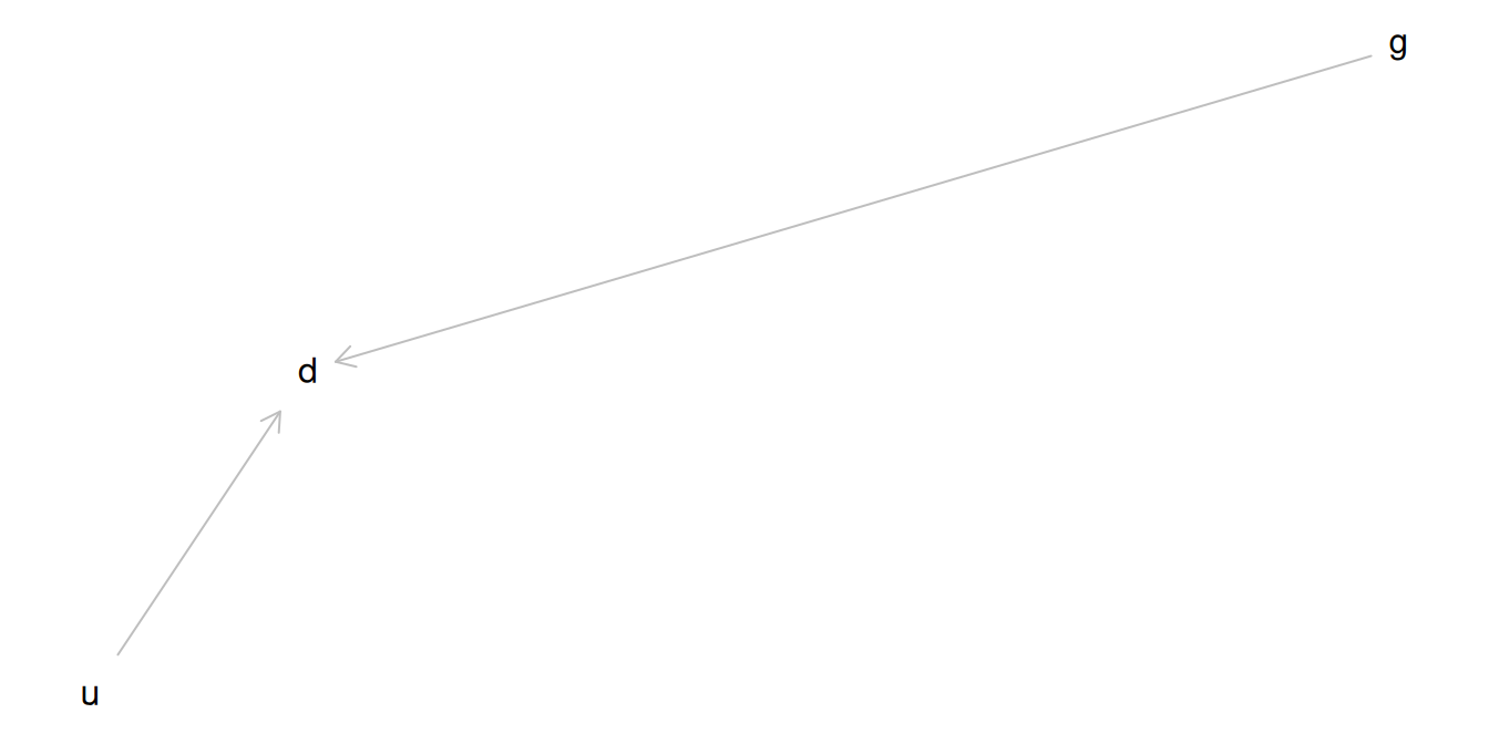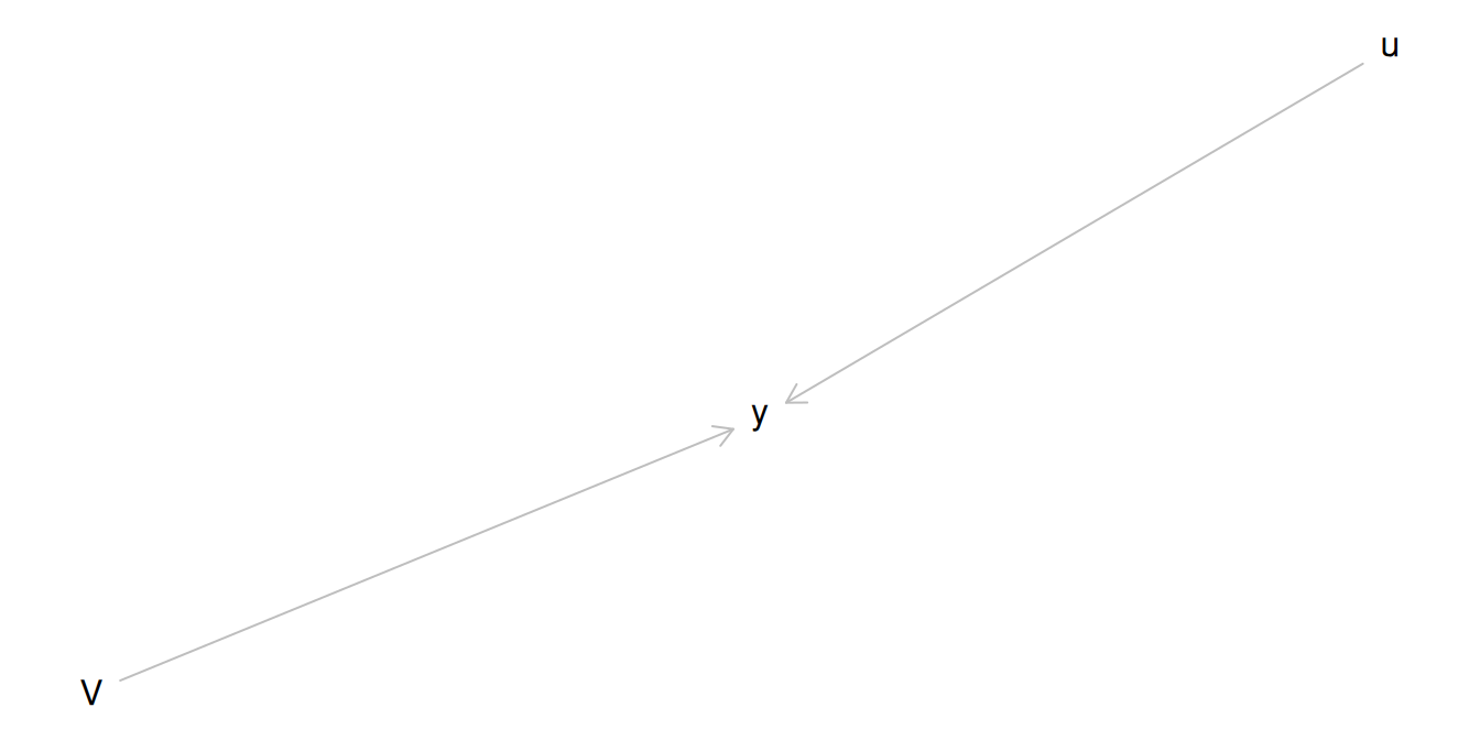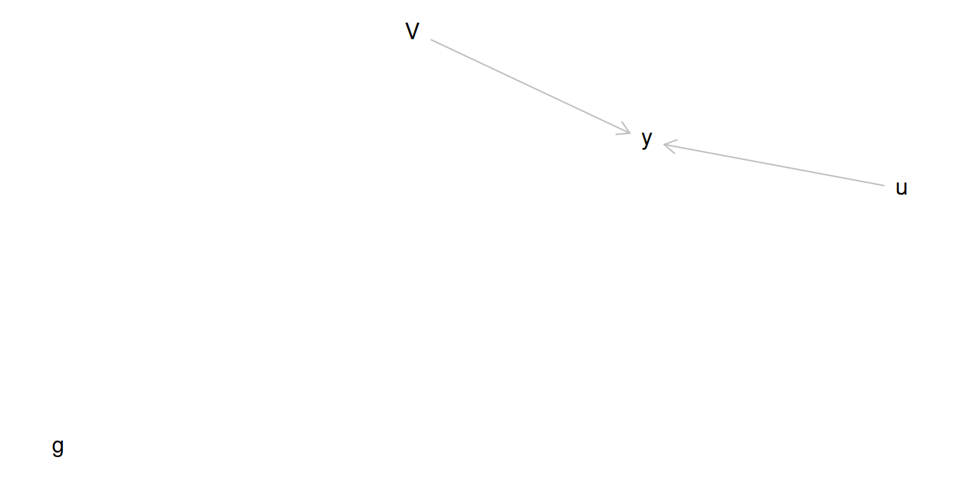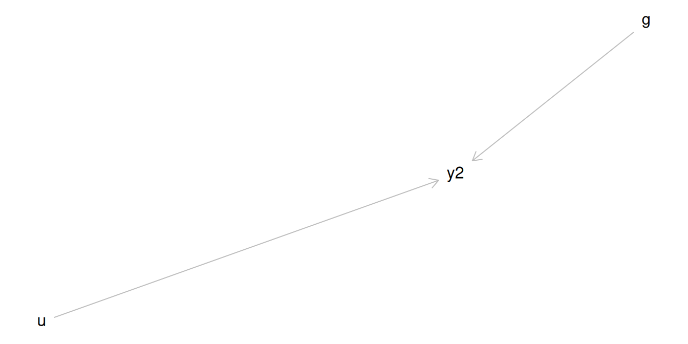 Im DAG Abbildung 12.2 ist u als Ursache von y2 angegeben. u steht hier stellvertretend für alle weiteren Ursachen von y2, vermutlich sind das sehr viele. Aber sie interessieren uns nicht. Daher können Sie u auch aus dem DAG weglassen. Streng genommen sollten Sie es sogar weglassen, denn im DAG zeigt man nur diejenigen Variablen, die für Ihre Hypothese von Belang sind. Da u keine Verbindung zum Pfad g -> y2 hat, brauchen wir es für die Bestimmung des Kausaleffekts nicht zu berücksichtigen.\(\square\)