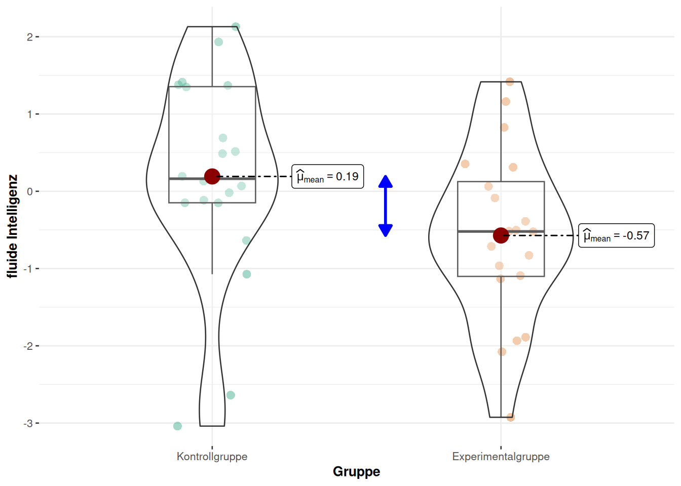 Sauer & Lustig (2023) untersuchten in einer Querschnittsstudie den Effekt des Wirkstoff Bringnixtin auf die fluide Intelligenz. Die Autoren nahmen an, dass der Wirkstoff den individuellen Wert der abhängigen Variable erhöhen würde.