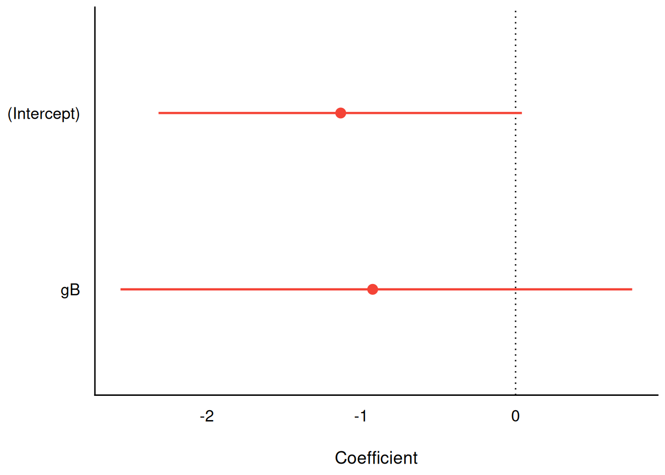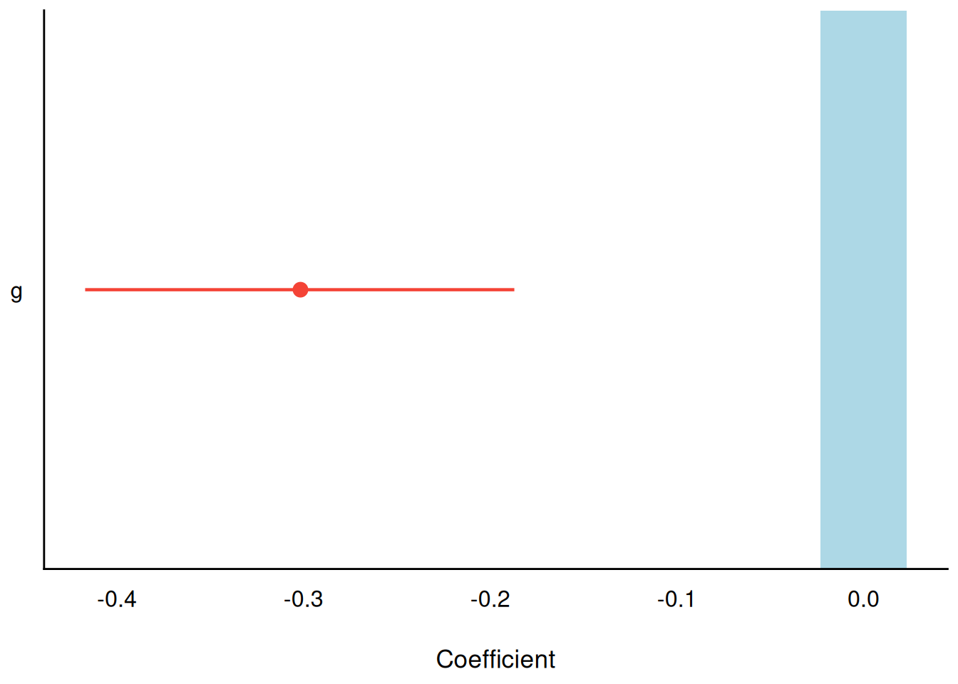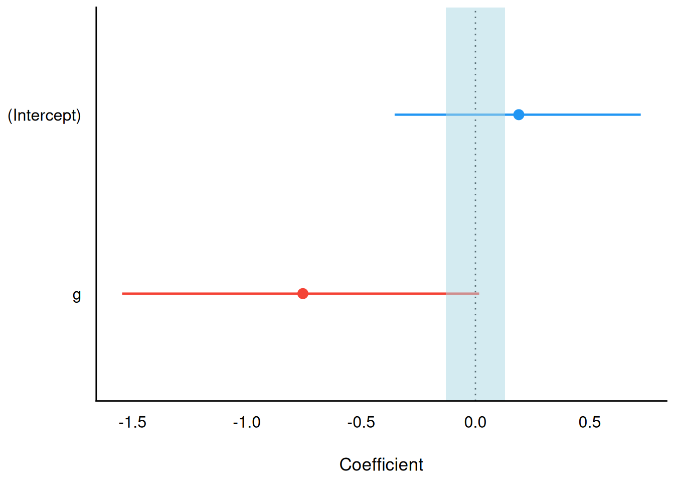Das Modell ist sicher ziemlich sicher, dass der Effekt von g (in der Population) negativ ist. Aber eine kleine Chance, dass der Effekt von g doch (ungefähr) Null oder sogar positiv ist, bleibt.