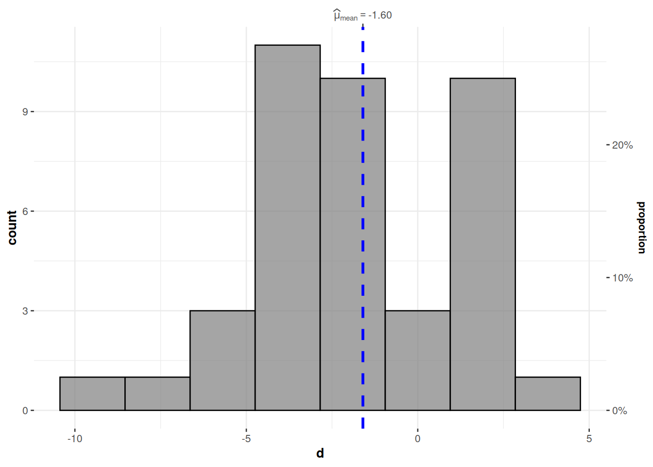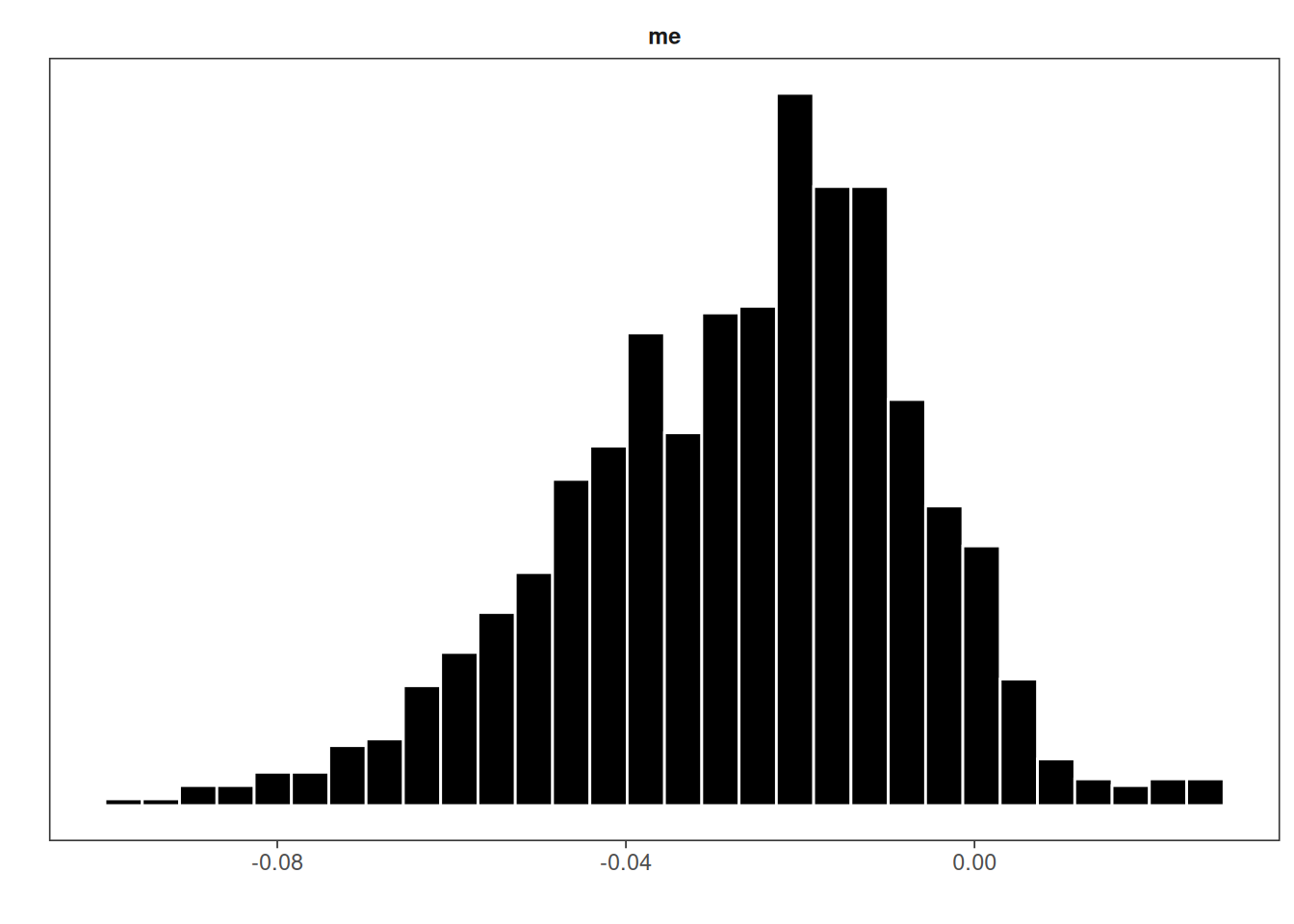 pd gibt die Wahrscheinlichkeit (laut Modell) an, dass der Effekt in der Population negativ bzw. positiv ist (d.h. gleich dem Vorzeichen des Punktschätzers; in diesem Fall negativ).\(\square\)