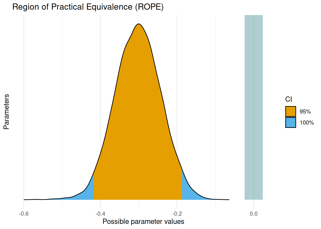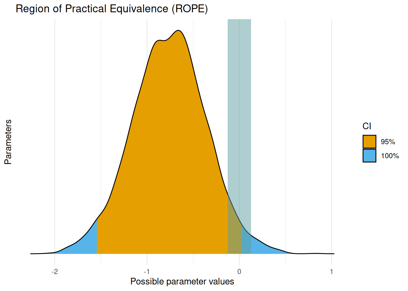 Mit dem ROPE-Verfahren kann man eine “Praktisch-Null-Hypothese” testen, also ob ein Bereich um die Null herum, also “Null plus-minus ein bisschen” im Hauptbereich im Hauptbereich (95%-KI) enthalten ist.