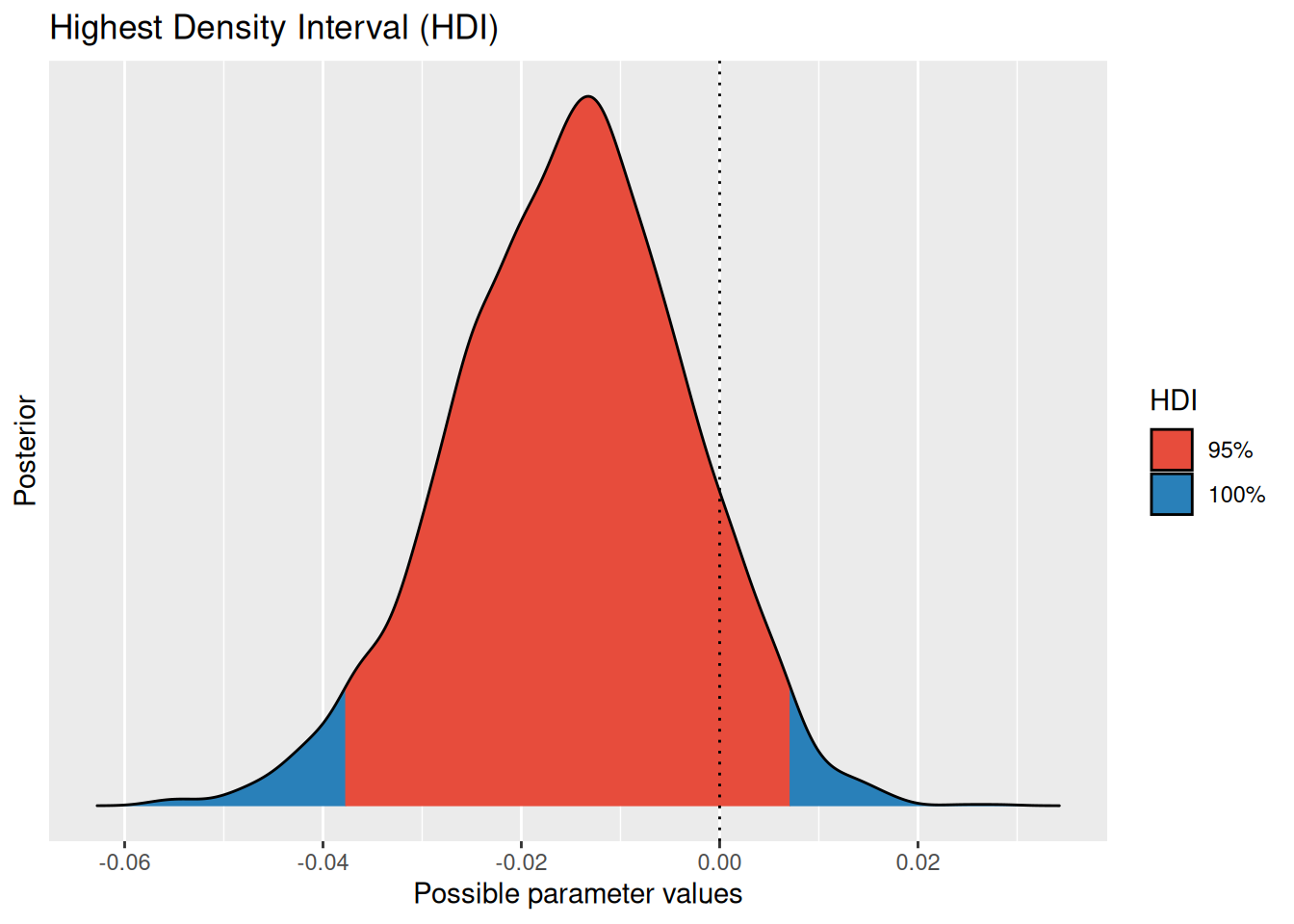 hdi(post$indirect)hdi(post$indirect) |> plot()Wie man sieht, ist die Null im Intervall enthalten.