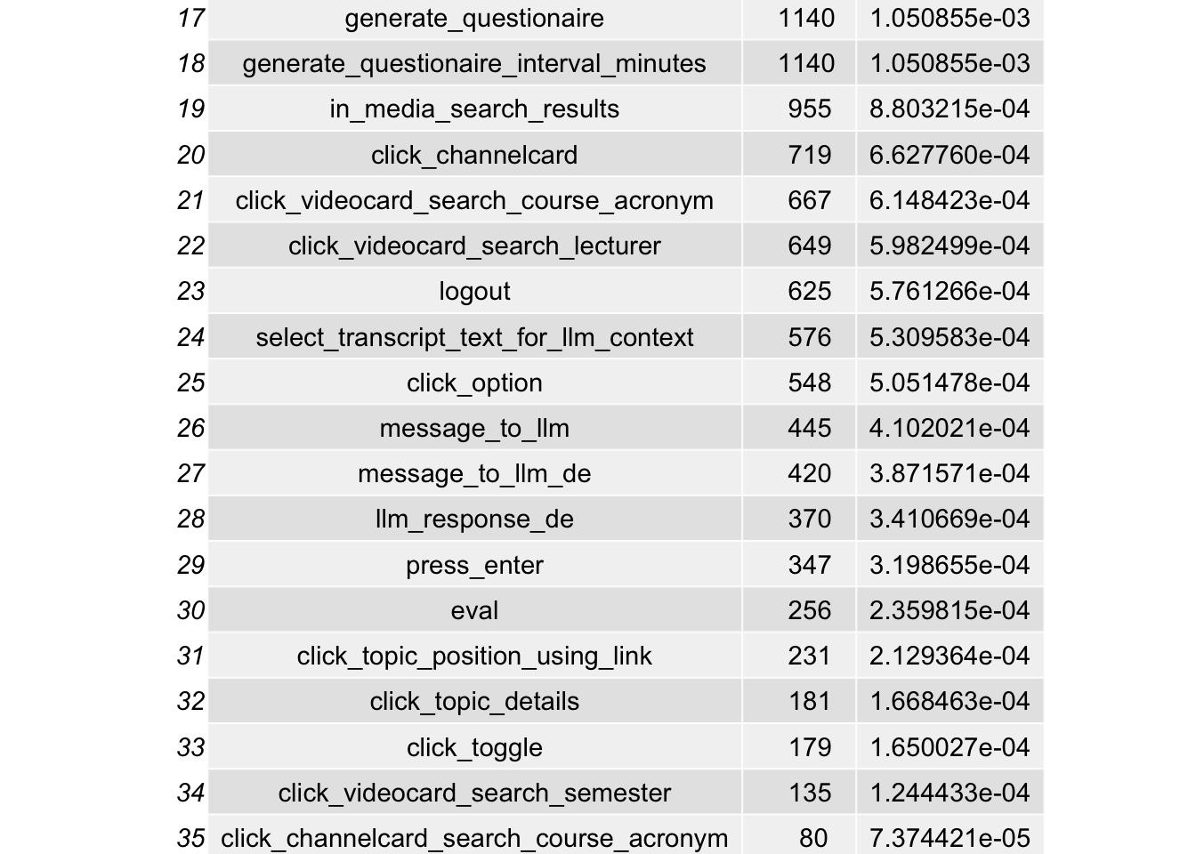 Die Matomo-Klickdaten aller Semester der Projektlaufzeit wurden für diese Analyse verarbeitet. Mit Hilfe einer R-Pipeline wurden eine Reihe von Forschungsfragen analysiert.
