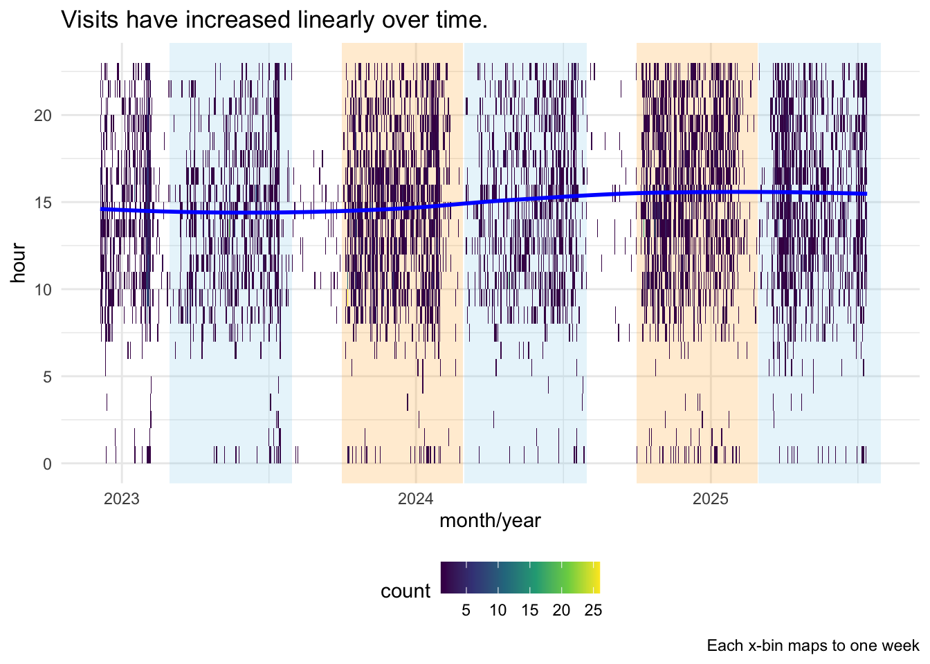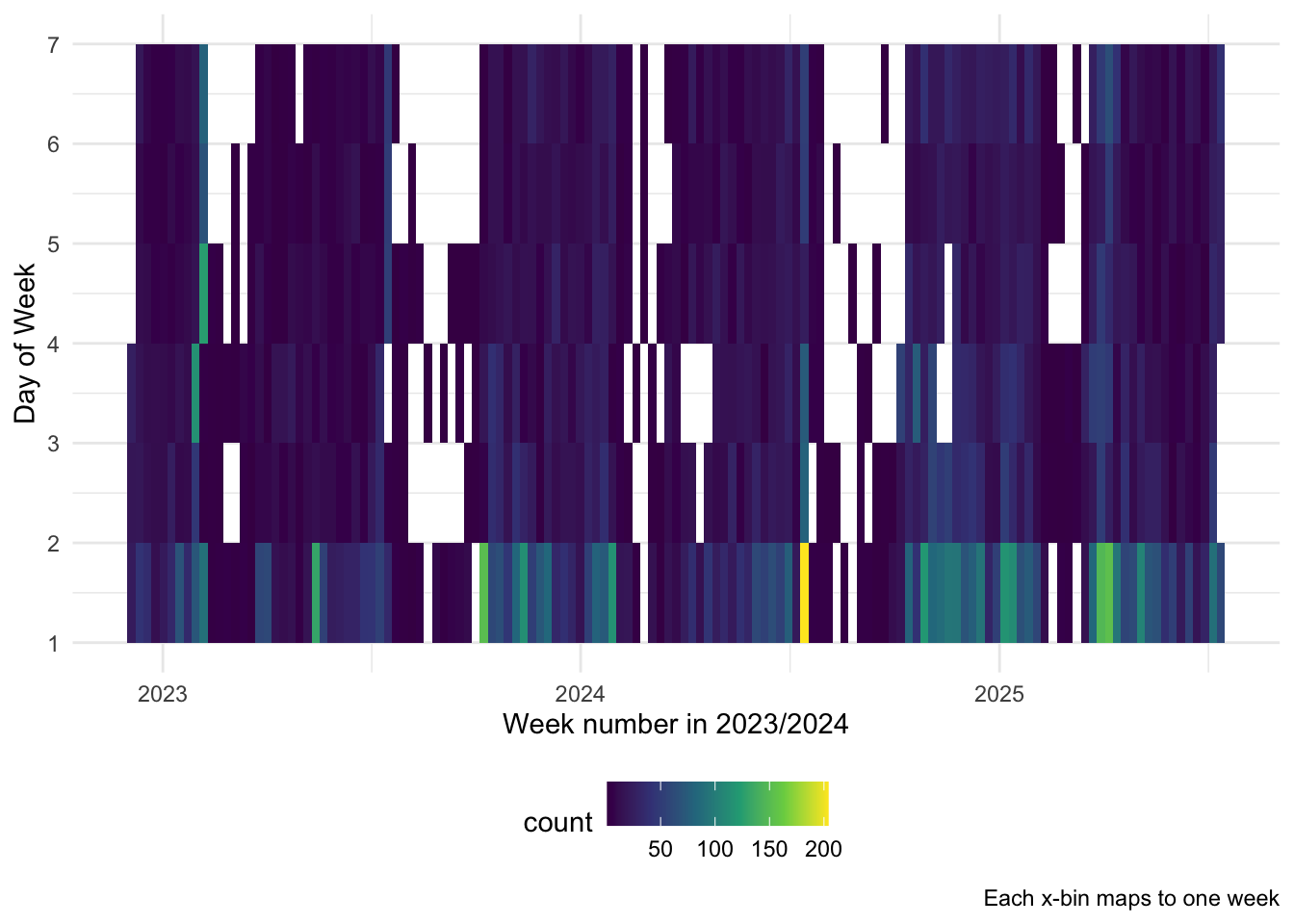 geom_bin2d(binwidth = c(7, 1)) + # 1 week, 1 hour