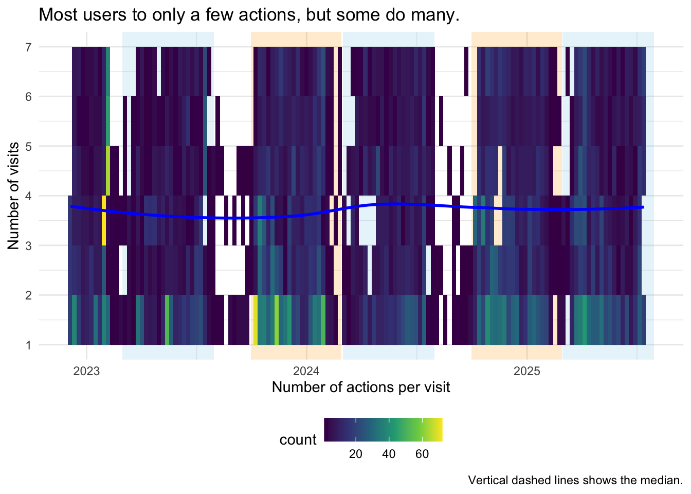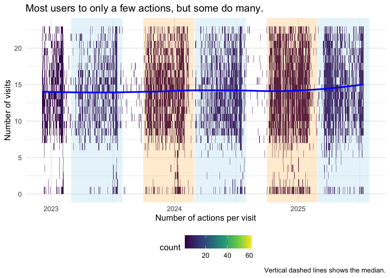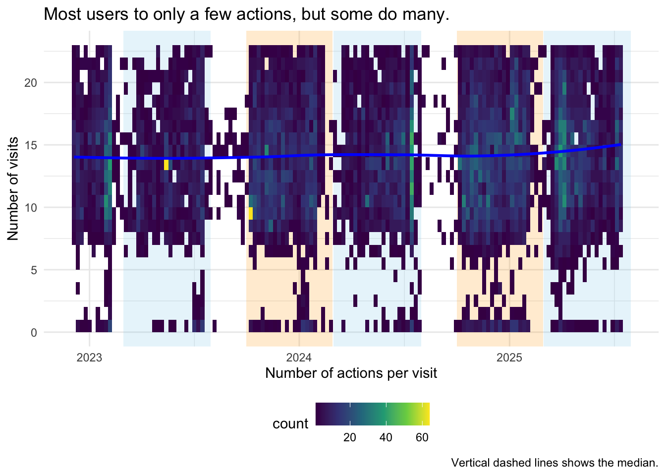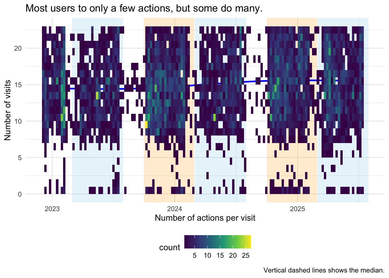 geom_bin2d(binwidth = c(7, 1)) # 1 week, 1 hour3.8.5 Anzahl der Visits nach Datum (Wochen) und Wochentag (bin2d)