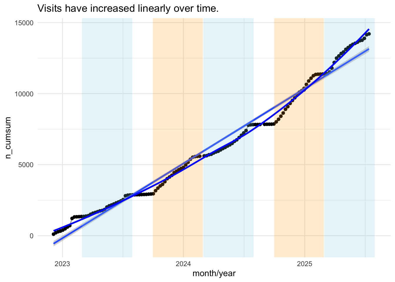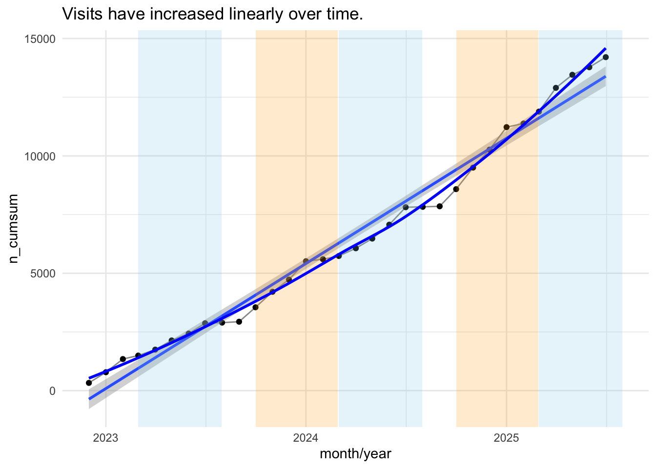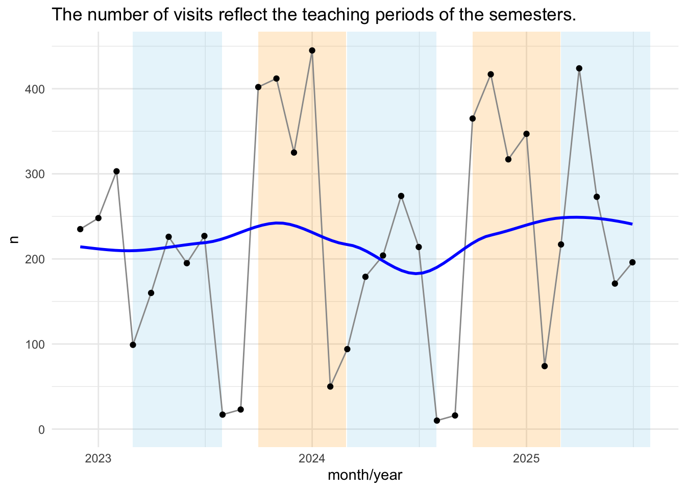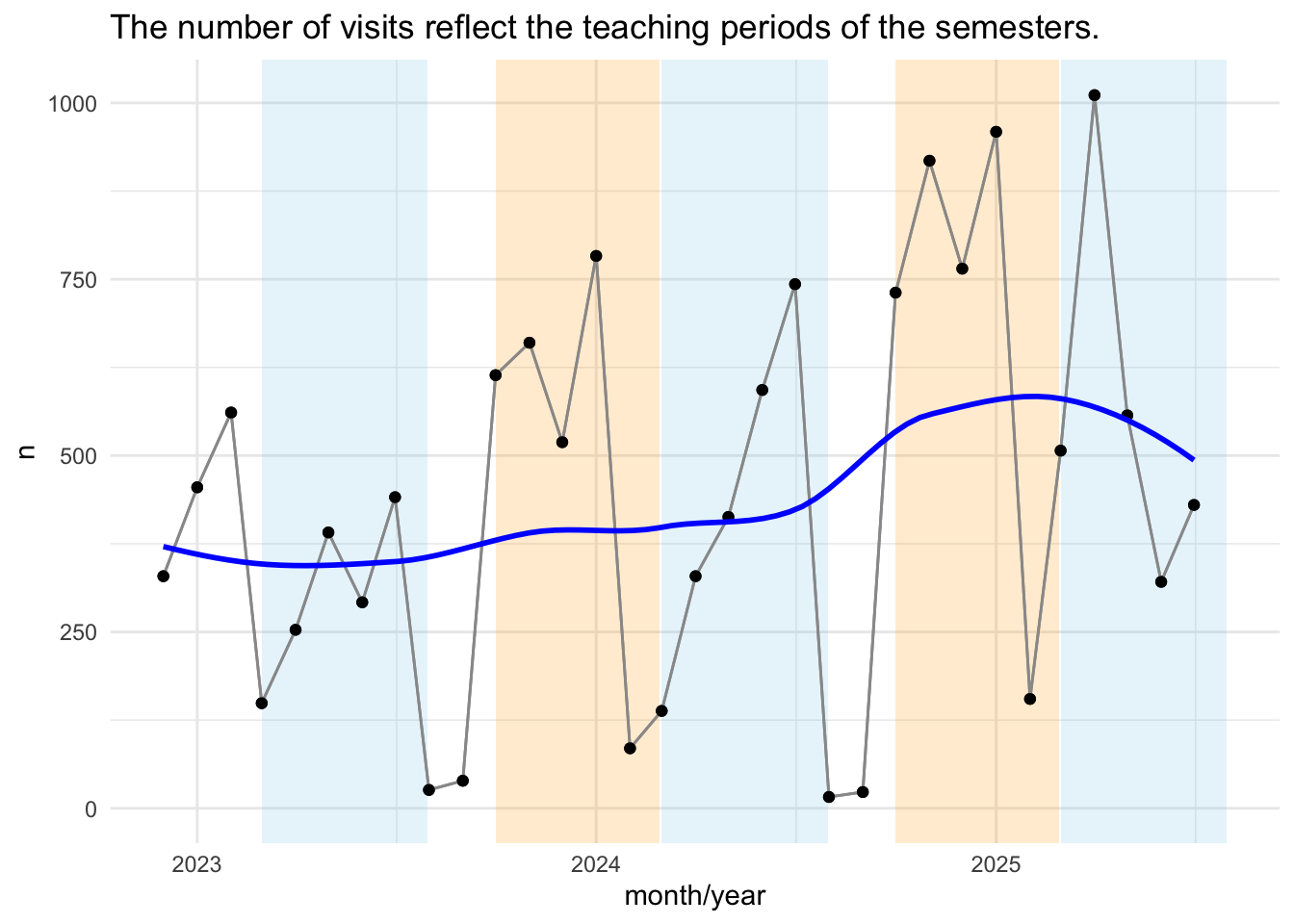 geom_smooth(method = "loess", se = FALSE, color = "blue")### Anzahl der Visits nach Datum (Wochen) und Uhrzeit (bin2d)