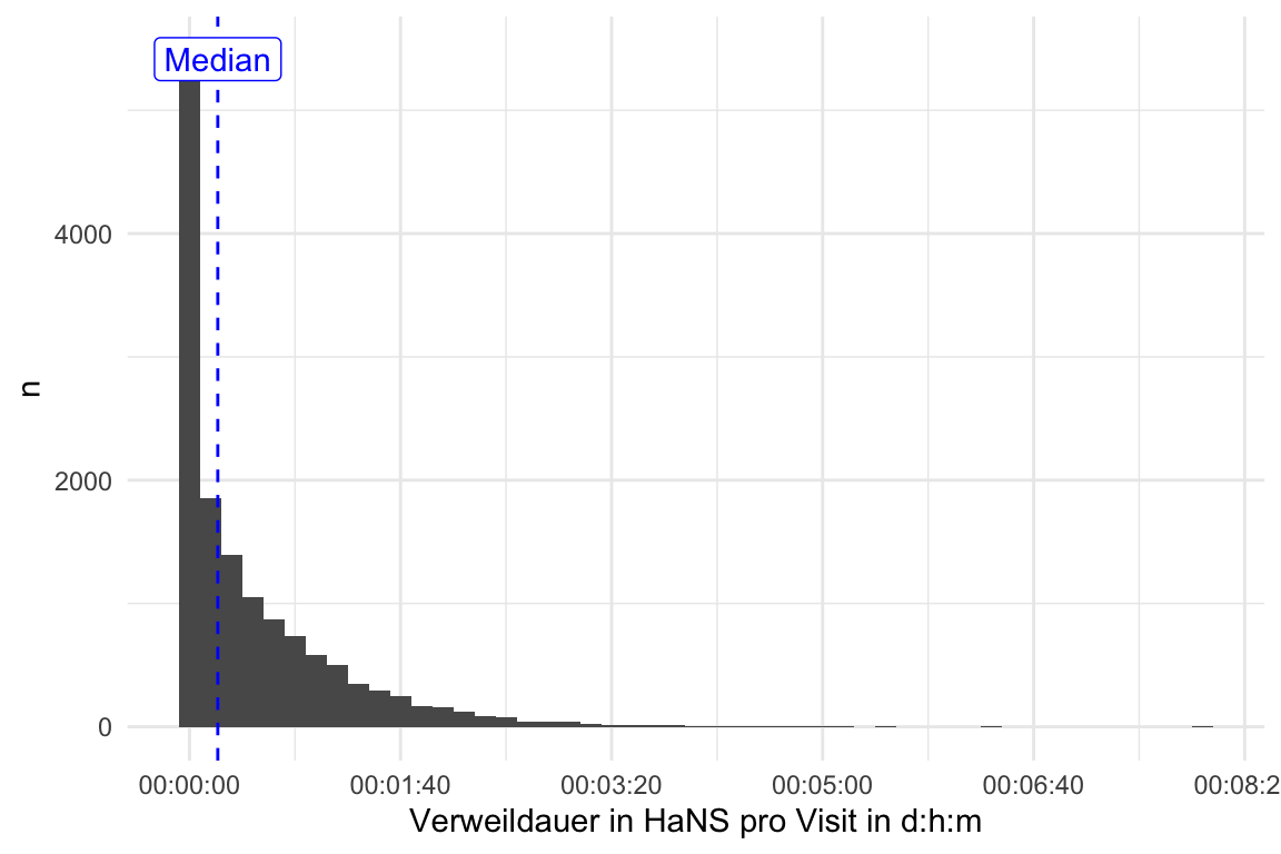 Die Verweildauer wurde berechnet als Differenz zwischen kleinstem und größtem Datumszeitwert (POSixct) eines Visits (also pro Wert der Variablen idvisit), vgl. Funktion diff_time. Diese Variable heißt time_diff im Objekt time_spent.