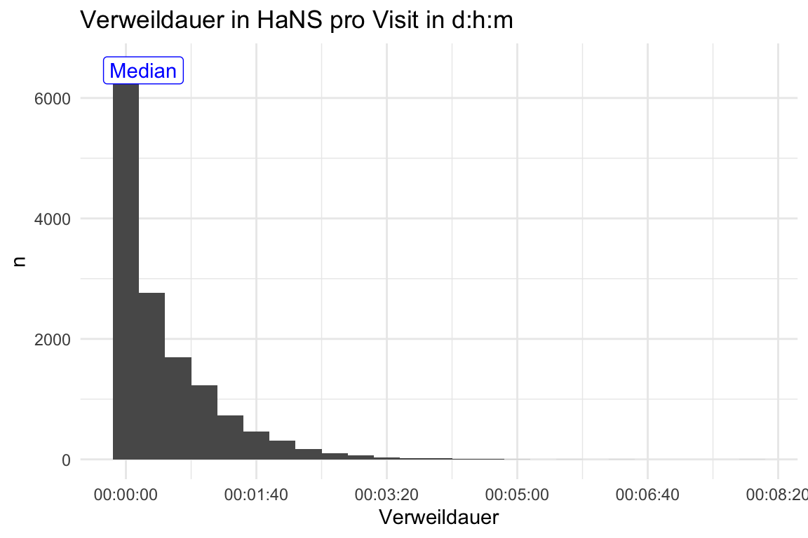 labs(y = "n", x = "Verweildauer in HaNS pro Visit in d:h:m") +
